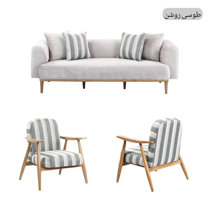 پایه های سه نفره و شزلون مبل بصورت جدا هست که برای سهولت باربری و اسیب کمتر به پایه ها هر رنگ پارچه با رنگ پارچه راه راه هم رنگ خودش ست میشه