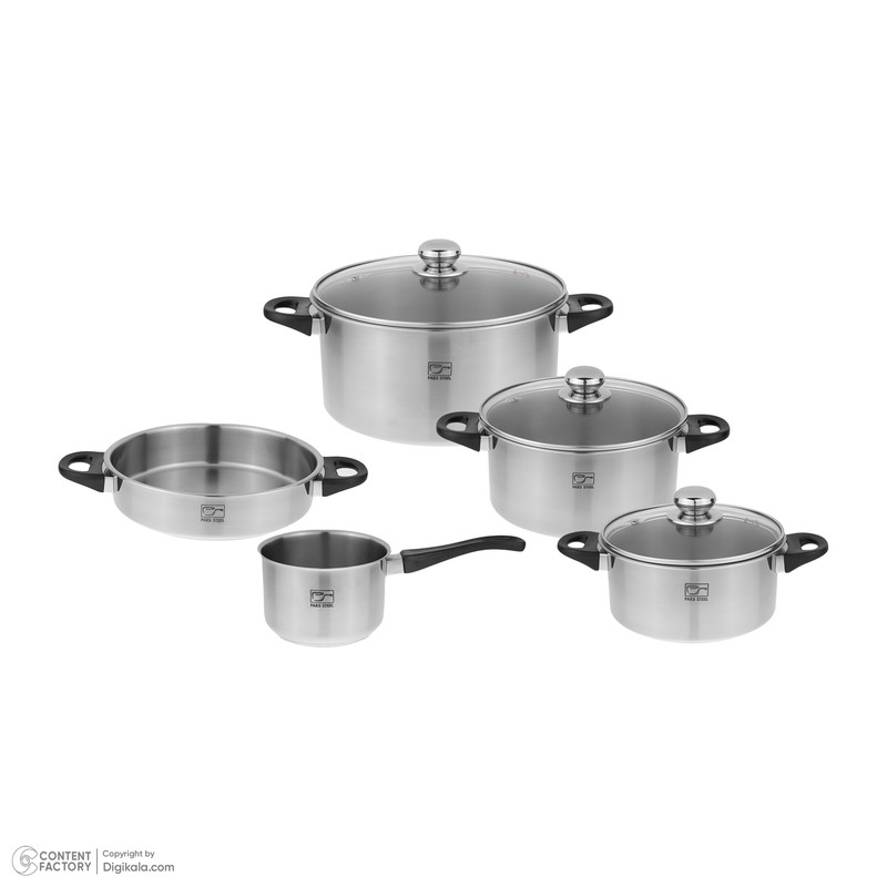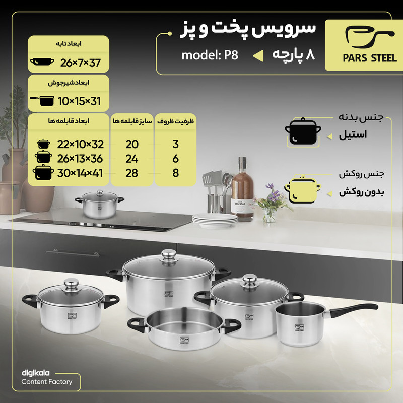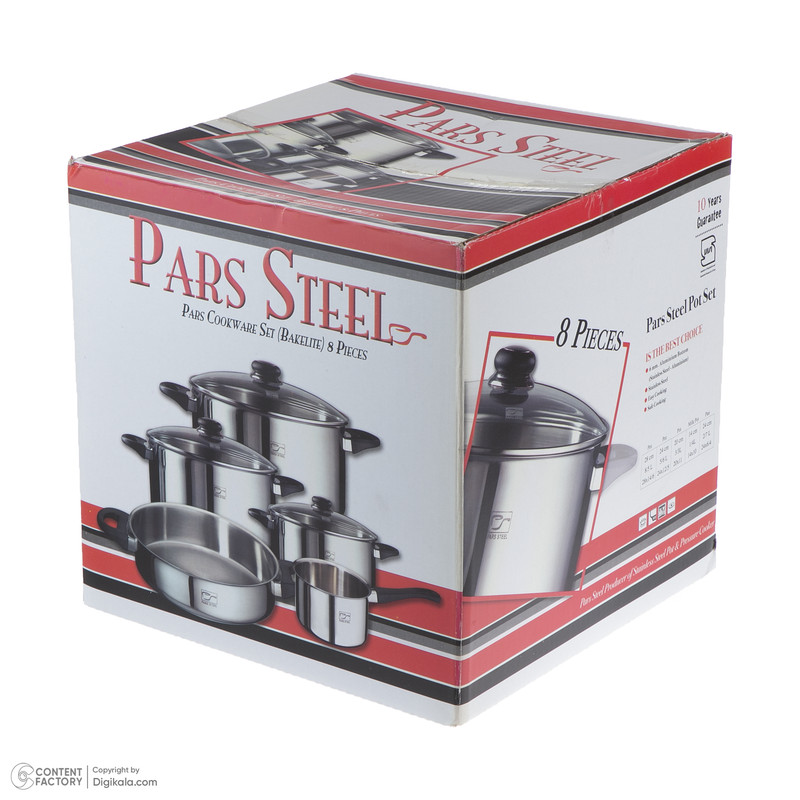 سرویس پخت و پز 8 پارچه پارس استیل مدل 08 ساخته شده از استیل ضدزنگ و دارای کیفیت بسیار بالاست. این ست زیبا بهدلیل نداشتن روکش یکی از سالمترین ظروفی است که برای آشپزی مورد استفاده قرار میگیرد. سرویس 8 پارچهی پارس استیل شامل 3 عدد قابلمه، 1 عدد شیرجوش و یک عدد تابه است و قابلمهها دارای در هستند که در مجموع 8 پارچه را تشکیل میدهند. این سرویس قابلمه و تابه دستههایی از جنس باکالیت دارد که از مقاومت مطلوبی دربرابر حرارت برخوردار هستند. درپوشهای این سرویس از جنس پیرکس هستند که برای مقاومت بیشتر قاب فلزی دارند و برای خروج بخار نیز روی درپوشها سوپاپ طراحی شده است. سطوح ظروف ضدخش است و با خیالی آسوده میتوانید برای تمیزی بهتر آنها را در ماشین ظرفشویی شستوشو دهید. کفی ضخیم ظروف دوجداره است و از سوختن و چسبیدن غذا جلوگیری میکند. شرکت پارس استیل بهعنوان تولیدکنندهی قابلمه و زودپز تماماستیل در ایران از سال 1363 فعالیتش را آغاز کرده است. این شرکت با استفاده از بهترین تکنولوژی روز، همواره سعی در تولید محصولاتی با کیفیت بالا و قابلرقابت در بازارهای جهانی داشته است.