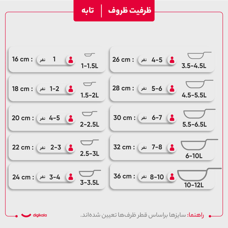 وزن ظروف: قابلمه سایز ۳۲: ۲۳۰۰ گرم، قابلمه سایز ۲۸: ۱۹۸۰ گرم، قابلمه سایز ۲۴: ۱۵۸۵ گرم، قابلمه سایز ۲۰: ۹۴۵ گرم، تابه سایز ۲۸: ۱۹۱۰گرم