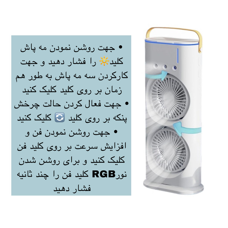 سایر مشخصات: نور پردازی RGB- دارای مه پاش- قابلیت چرخش- زاویه شیب قابل تنظیم- دارای دو عدد فن- دارای 3 سطح سرعت-