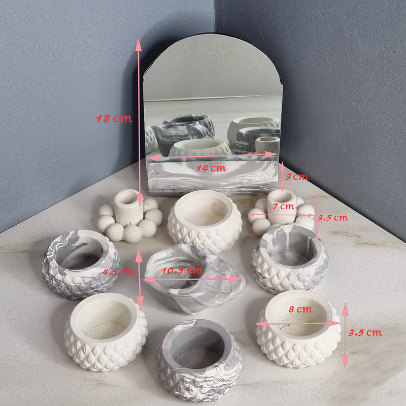 هفت سین 10 پارچه مدل ثمینا طرح سنگ شامل استند آینه به ابعاد 3×5.5×14، شش ظرف هفت سین به ابعاد 3.5×8×8، دو عدد جاشمعی مرواریدی به ابعاد 3.5×7×7 و یک جاوارمری طرح صدف به ابعاد 5×7×10.5 هست و اینکه آینه نیز به همراه هفت سین برای شما ارسال می گردد.
