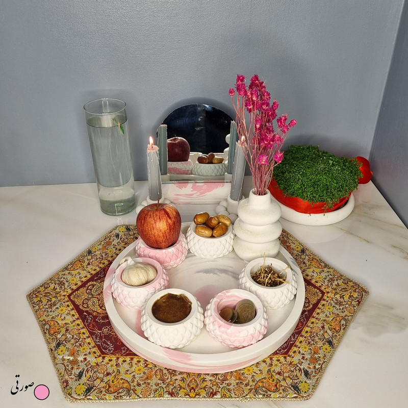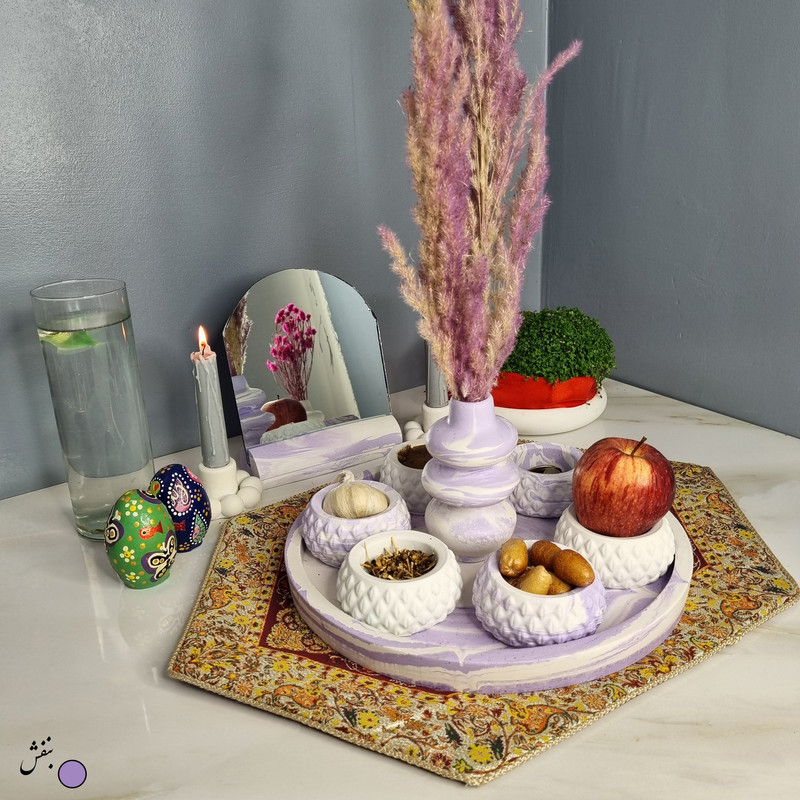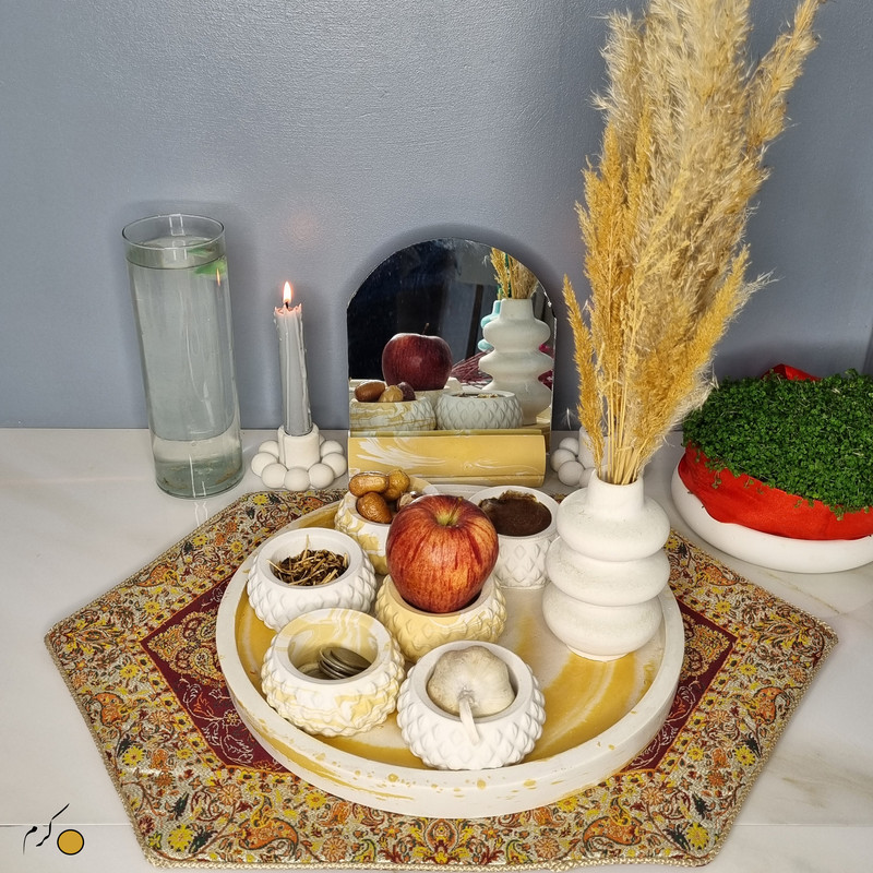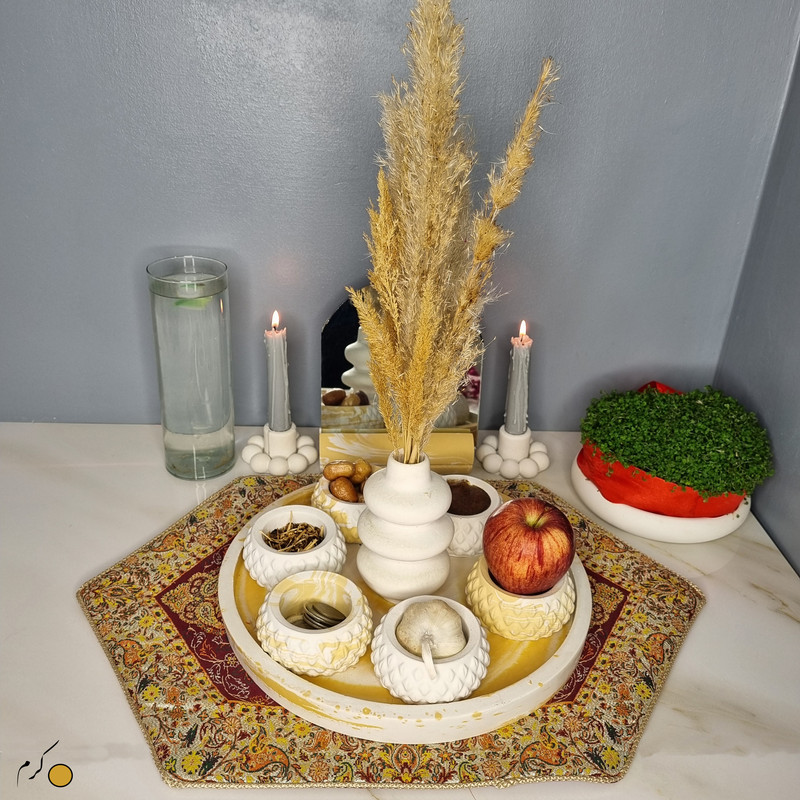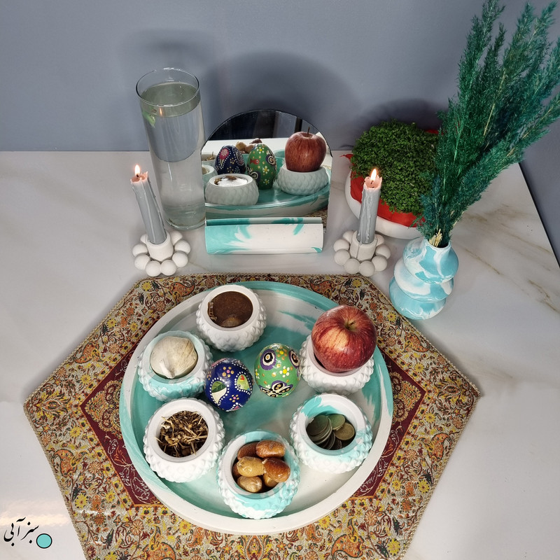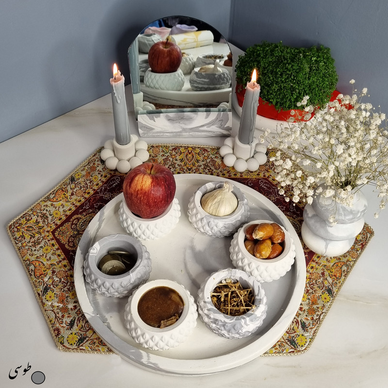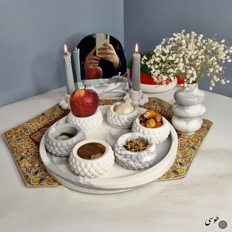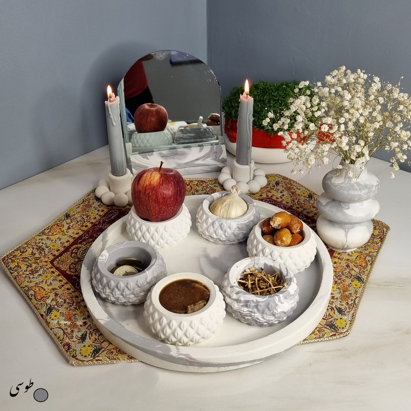 یک هفتسین کوچک و بهصرفه اقتصادی، جوانب زیبایی و معنوی هفتسین را در یک فضای کمحجم به شما معرفی میکند. این محصول، شامل آینه و استند آن، دو شمعدان، شش ظرف هفت سین ، یک گلدان بتنی آبشاری و سینی بتنی است. با این هفتسین جمعوجور، شما میتوانید تمام نمادهای مهم نوروز را در فضای محدود خود گنجانده و لحظاتی شاد و پر از هنر و زیبایی را به اشتراک بگذارید. این هفتسین زیبا ابر و بادی یک گزینه ایدهآل برای کسانی است که به دنبال یک آغاز سال نو معنوی و زیبا هستند و همچنین توجهی به محیط قرارگیری هفتسین و صرفة اقتصاد آن دارند. یک آثار هنری زیبا و منحصربهفرد که به آرامش و زیبایی نوروزی به خانهتان جلوه خواهد داد.