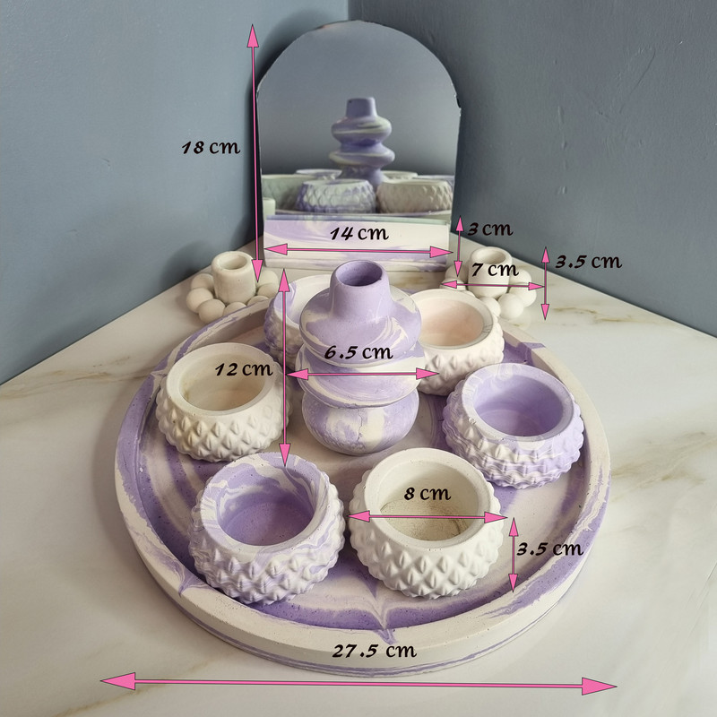 هفت سین 11 پارچه مدل آدریا شامل استند آینه به ابعاد 3×5.5×14 سانتی متر ، شش ظرف هفتسین به ابعاد 3.5×8×8 سانتی متر ، دو عدد جاشمعی مرواریدی به ابعاد 3.5×7×7 سانتی متر، گلدان آبشاری به ابعاد 12×6.5×6.5و سینی بتنی به ابعاد ابعاد 2.5×27.5×27.5 سانتی متر است و اینکه آینه با ابعاد 14 × 16 نیز به همراه هفتسین برای شما ارسال می گردد.