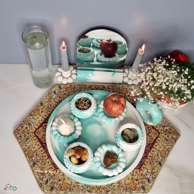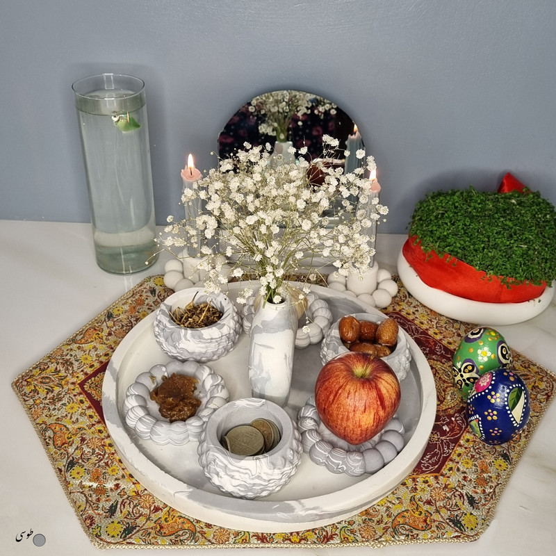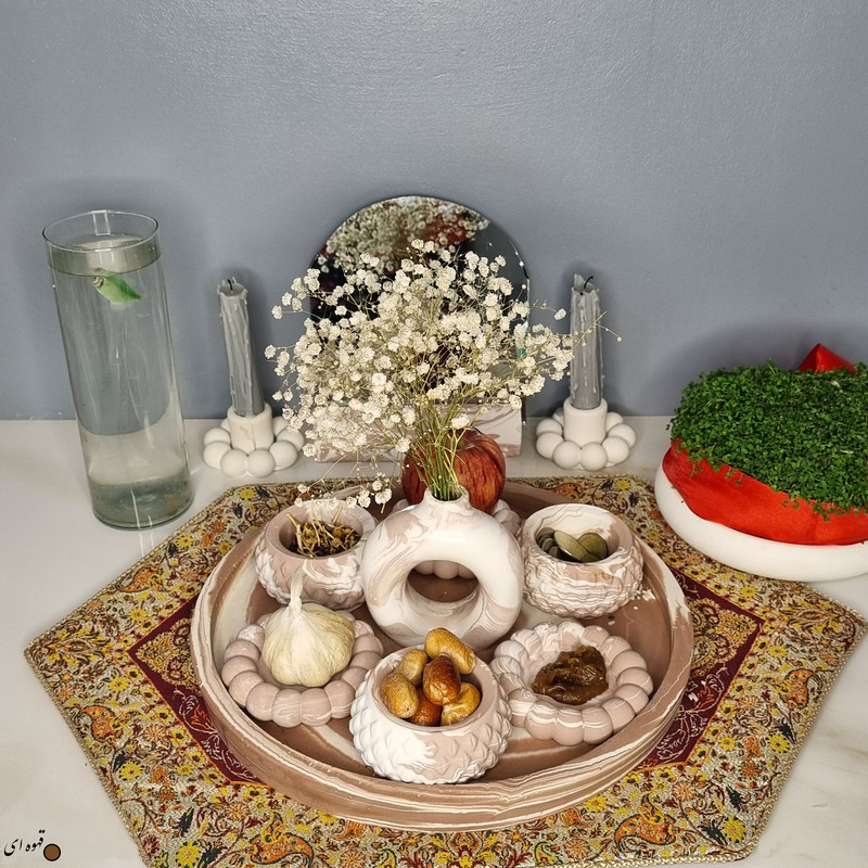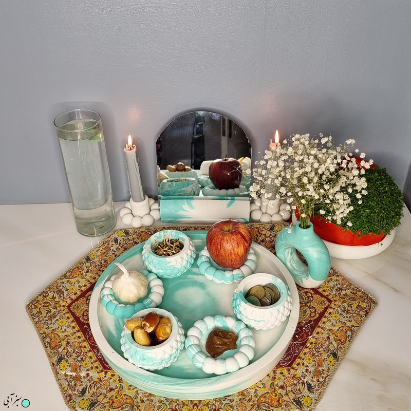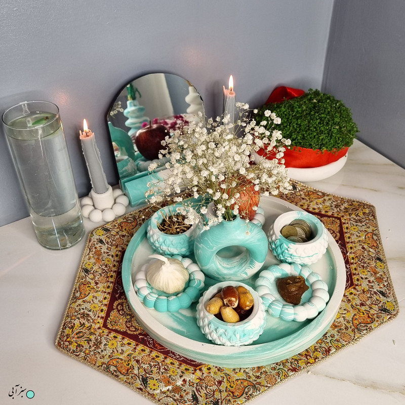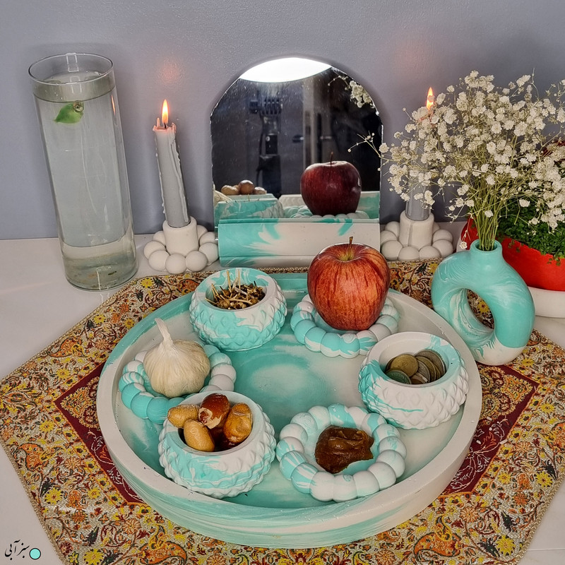 یک هفتسین کوچک و بهصرفه اقتصادی، جوانب زیبایی و معنوی هفتسین را در یک فضای کمحجم به شما معرفی میکند. این محصول، شامل آینه و استند آن، دو شمعدان، شش ظرف هفت سین ، یک گلدان بتنی دونات و سینی بتنی است. با این هفتسین جمعوجور، شما میتوانید تمام نمادهای مهم نوروز را در فضای محدود خود گنجانده و لحظاتی شاد و پر از هنر و زیبایی را به اشتراک بگذارید. این هفتسین زیبا ابر و بادی یک گزینه ایدهآل برای کسانی است که به دنبال یک آغاز سال نو معنوی و زیبا هستند و همچنین توجهی به محیط قرارگیری هفتسین و صرفة اقتصاد آن دارند. یک آثار هنری زیبا و منحصربهفرد که به آرامش و زیبایی نوروزی به خانهتان جلوه خواهد داد.