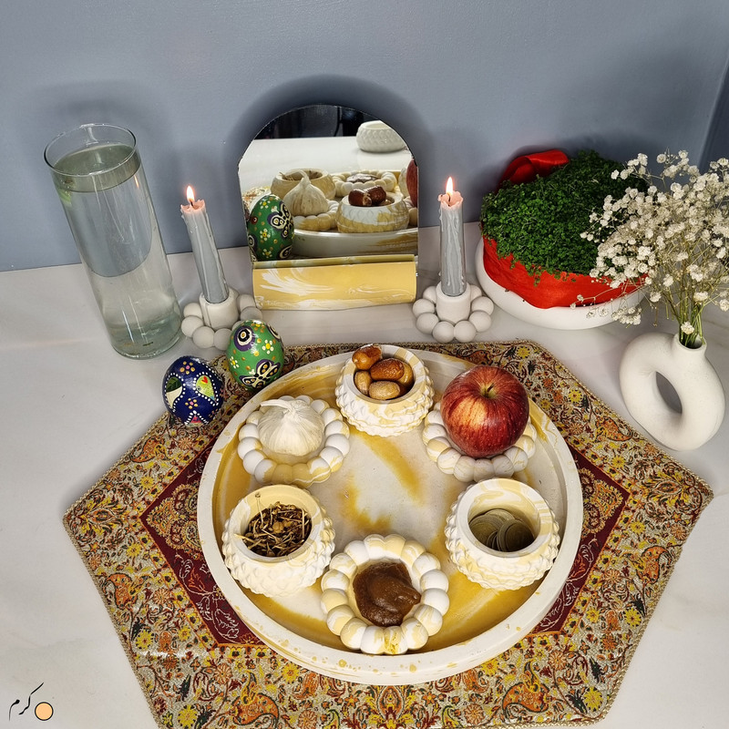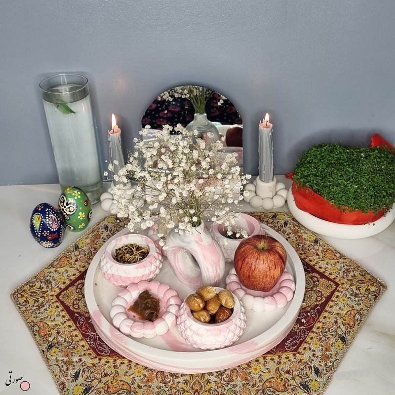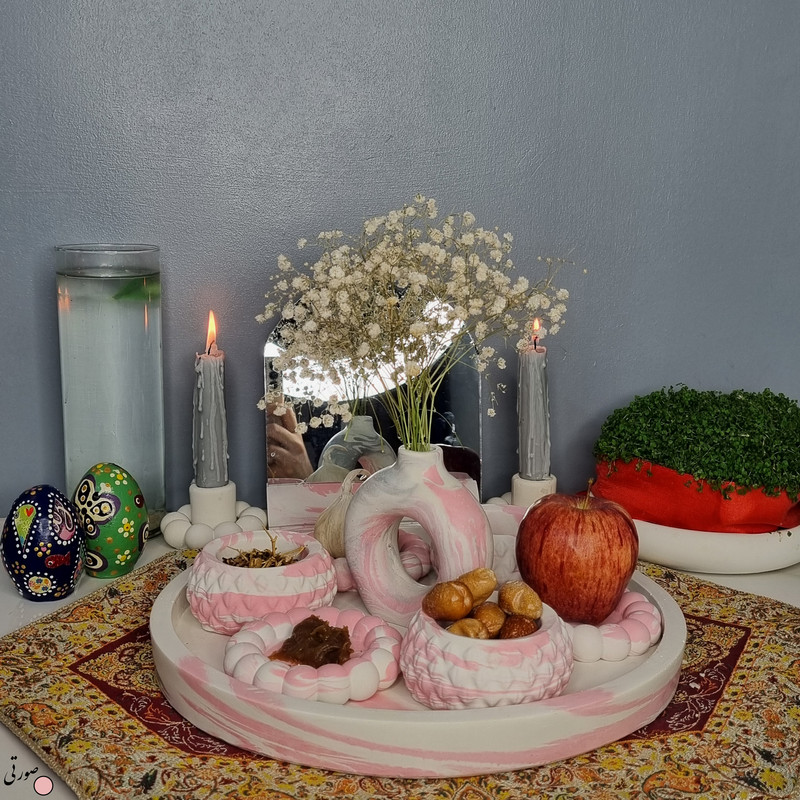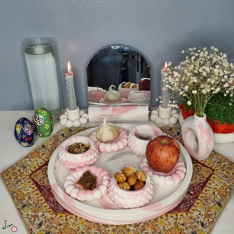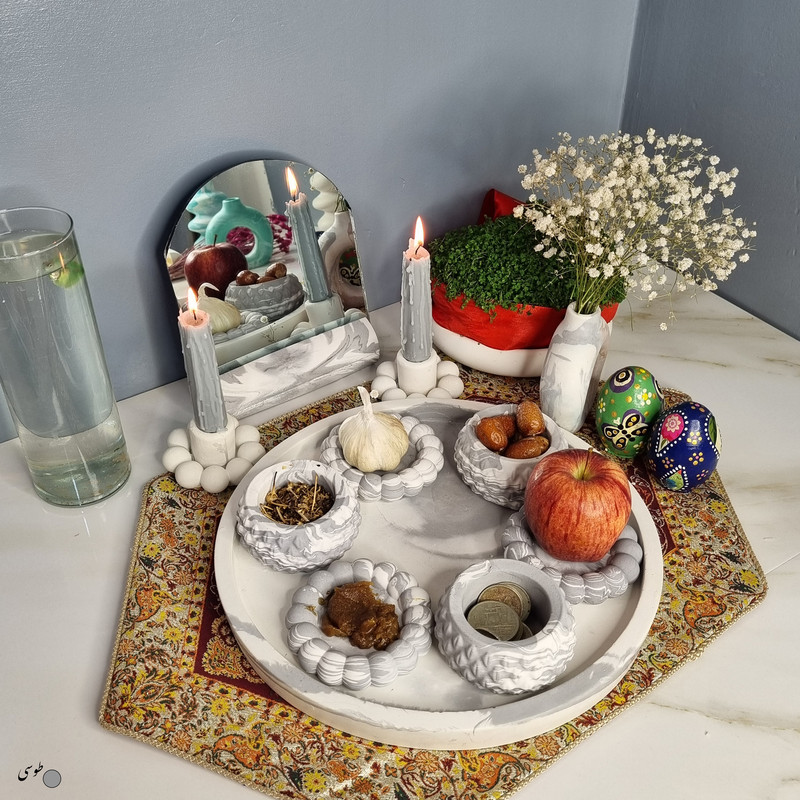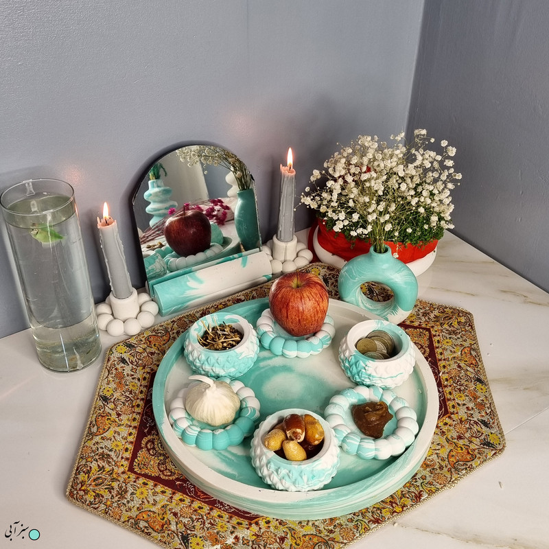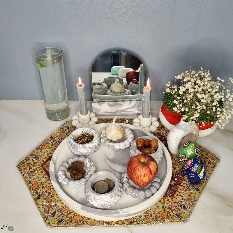 یک هفتسین کوچک و بهصرفه اقتصادی، جوانب زیبایی و معنوی هفتسین را در یک فضای کمحجم به شما معرفی میکند. این محصول، شامل آینه و استند آن، دو شمعدان، شش ظرف هفت سین ، یک گلدان بتنی دونات و سینی بتنی است. با این هفتسین جمعوجور، شما میتوانید تمام نمادهای مهم نوروز را در فضای محدود خود گنجانده و لحظاتی شاد و پر از هنر و زیبایی را به اشتراک بگذارید. این هفتسین زیبا ابر و بادی یک گزینه ایدهآل برای کسانی است که به دنبال یک آغاز سال نو معنوی و زیبا هستند و همچنین توجهی به محیط قرارگیری هفتسین و صرفة اقتصاد آن دارند. یک آثار هنری زیبا و منحصربهفرد که به آرامش و زیبایی نوروزی به خانهتان جلوه خواهد داد.