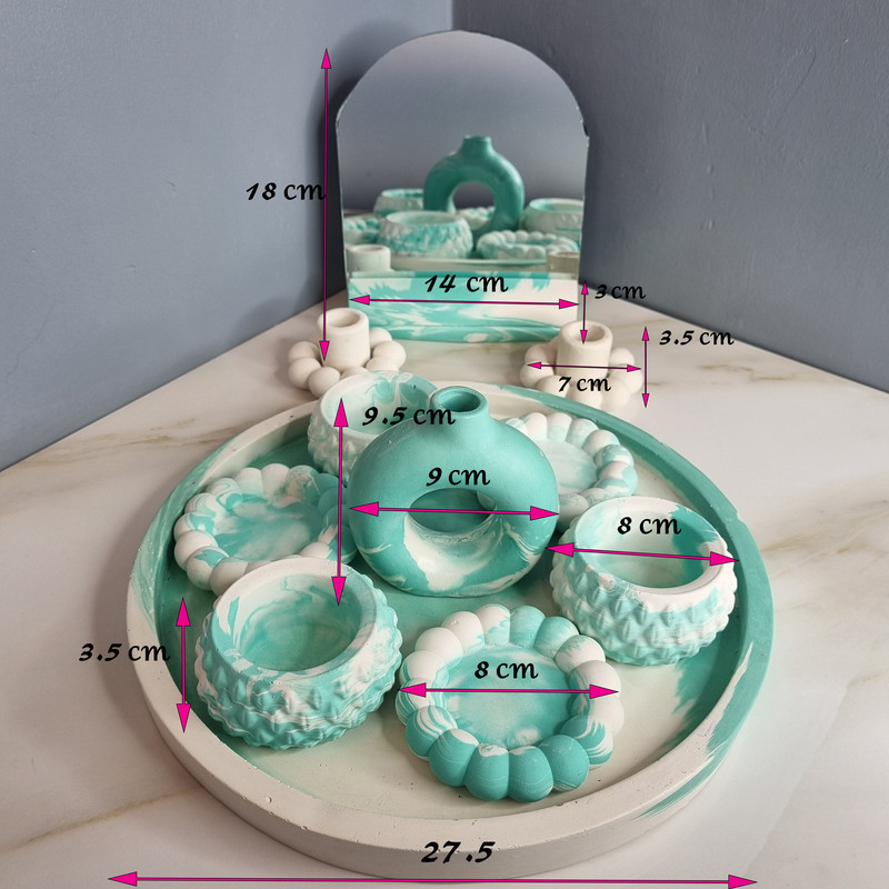 هفت سین 11 پارچه مدل فراهین شامل استند آینه به ابعاد 3×5.5×14 سانتی متر ، سه ظرف هفتسین مرواریدی به ابعاد2×8×8 ، سه ظرف هفتسین طرح دار به ابعاد 3.5×8×8 ، دو عدد جاشمعی مرواریدی به ابعاد 3.5×7×7 سانتی متر، گلدان دونات به ابعاد 9.5×3×9 و سینی بتنی به ابعاد ابعاد 2.5×27.5×27.5 سانتی متر است و اینکه آینه با ابعاد 14 × 16 سانتی متر نیز به همراه هفتسین برای شما ارسال می گردد.