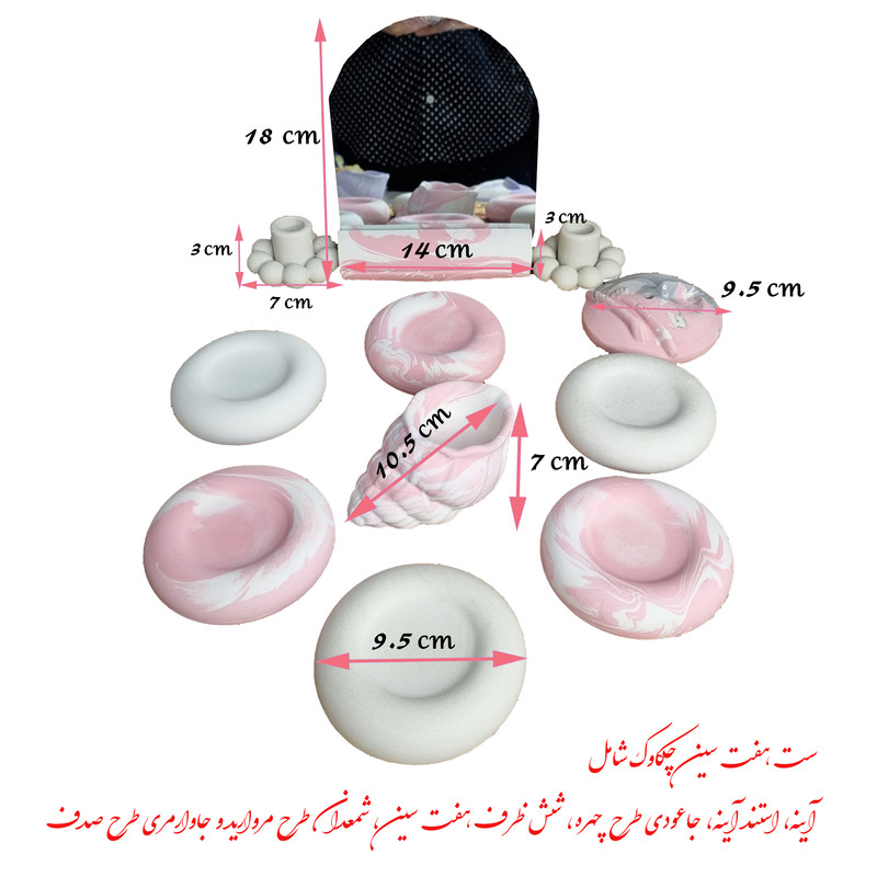 هفتسین 11 پارچه مدل چکاوک شامل استند آینه به ابعاد 3×5.5×14 سانتی متر ، شش ظرف هفتسین به ابعاد 3×9.5×9.5 سانتی متر، یک جاعودی طرح چهره آدم به ابعاد 3×9.5×9.5 سانتی متر ،دو عدد جاشمعی مرواریدی به ابعاد 3.5×7×7 سانتی متر و یک جا وارمری طرح صدف به ابعاد 5×7×10.5 سانتی متر است و اینکه آینه نیز به همراه هفتسین برای شما ارسال می گردد.