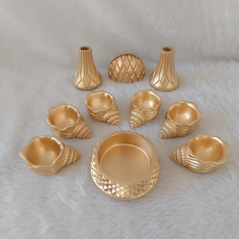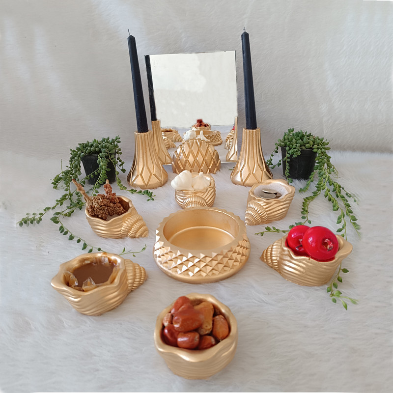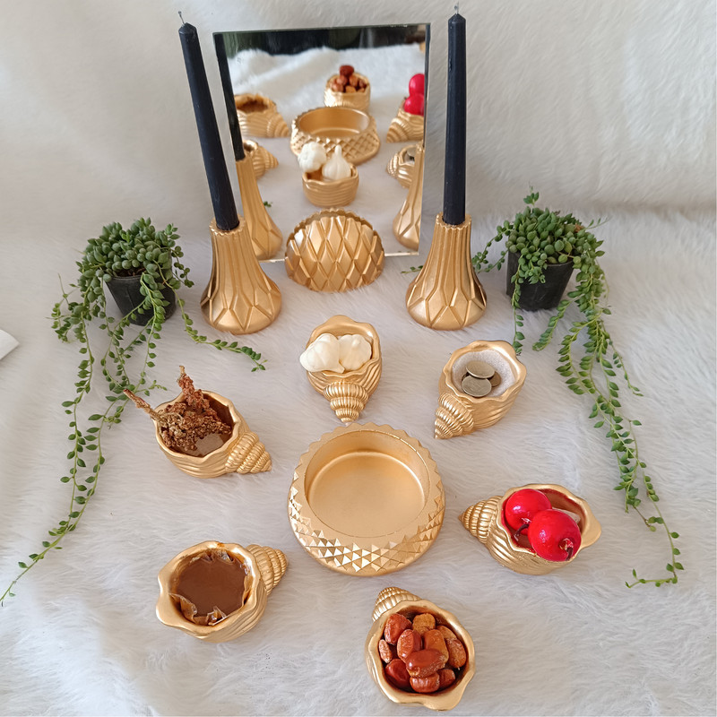 مجموعه ظروف هفت سین 10 پارچه مدل حلزون که شامل 6 عدد ظرف هفت سین حلزون ، دو عدد جاشمعی ، یک عدد ظرف سبزه یا تنگ ماهی و یک عدد استند آینه یا جاآینه ای میباشد. رنگ این محصول تک رنگ بوده یعنی هر رنگی که انتخاب میکنید تمام 10 عدد ظرف ارسالی به همان رنگ ارسال میشود . با یک دیزاین و کمی سلیقه میتوانید یک هفت سین بیاد ماندنی برای خود رقم بزنید و بعد از عید هم از این ظروف برای موارد دیگر مانند تزیین منزل یا محل کار ، ظرف سرو ، جای جواهرات ، گلدان یا ... استفاده کرد. جنس این ظروف از پودر سنگ میباشد . ارتفاع هر حلزون 4 سانت ، قطر داخلی 6 سانت ، طول 11 سانت ، ارتفاع جاشمعی 11 سانت ، قطر داخلی جاشمعی 18 میلیمتر ، قطر پایه 7 سانت ، ارتفاع استند آینه 7 سانت ، طول 10 و عرض 7 سانت ، قطر داخلی ظرف هفت سین 9.5 سانت و ارتفاع 4.5 سانت میباشد.رنگ تصویر اصلی طلایی میباشد