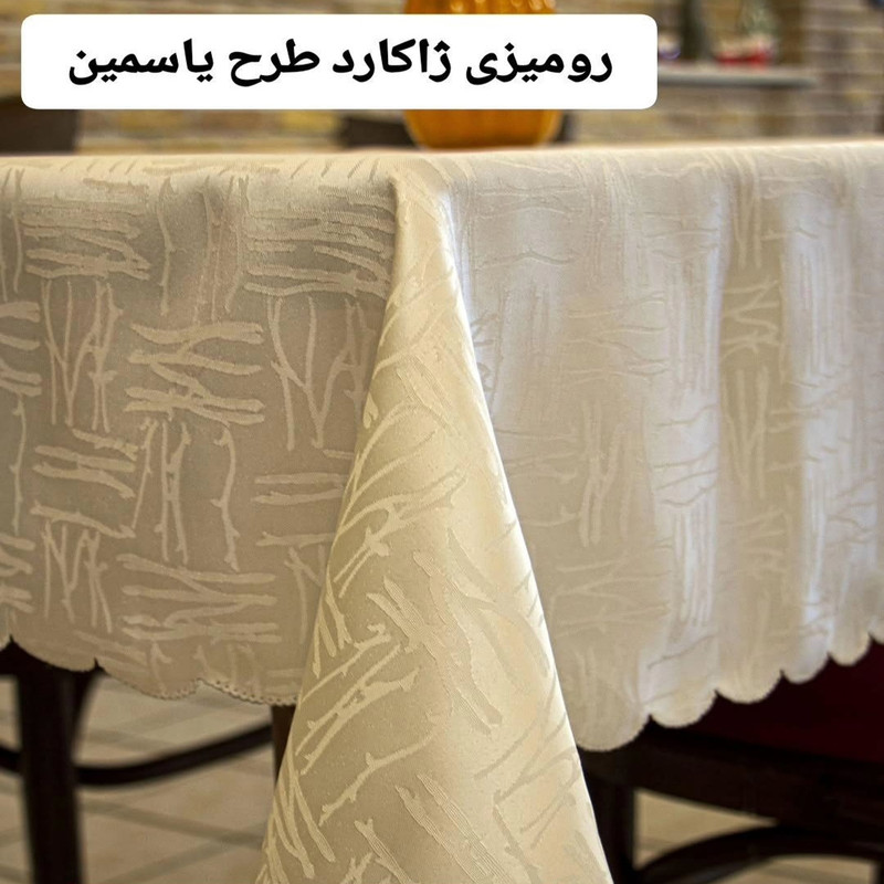 - لطفاً توجه فرمایید که رنگ محصول کمی روشن تر از تصویر میباشد - محصولی از شرکت معتبر رزین تاژ - سایز گرد با قطر 150 سانتی متر (+-3 cm) - چهار نفره - ضد لک - ضد چروک - قابل شست و شو - لبه های دالبر شده