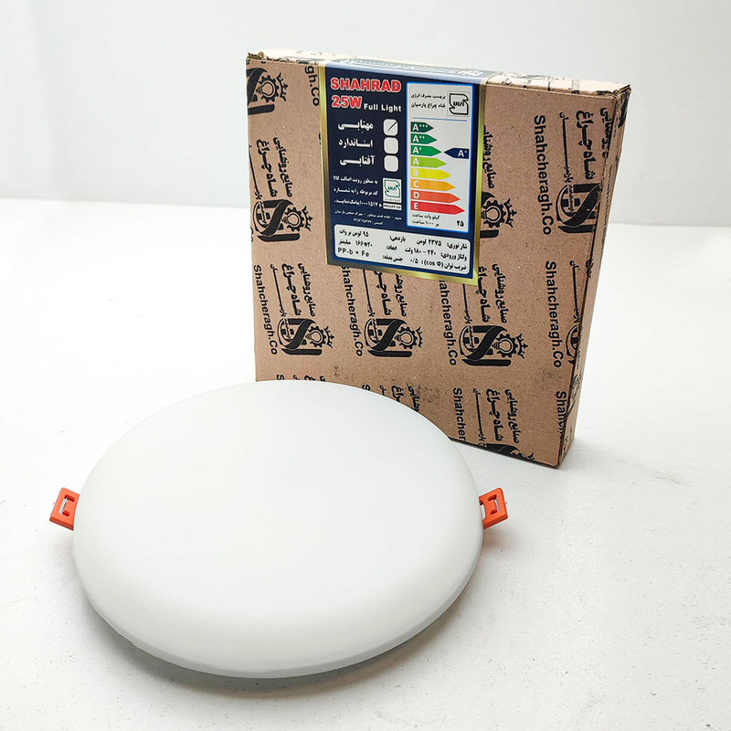 چراغ سقفی پنل ال ای دی فول لایت فنر سایز شو 25 وات شاهچراغ از پنل های گرد بدون لبه می باشد. نوردهی این محصولات در سه رنگ مهتابی، آفتابی و استاندارد(نچرال یا طبیعی یا روز) عرضه می شود. این پنل فاقد لبه بوده و همچنین فنر متغیر داشته و قابل استفاده برای قطر برش سقف از 4.5 تا 12 سانتی متر می باشد. جنس بدنه از آلومینیوم و دیفیوز از پلی کربنات مات بوده و نور را کاملا پخش میکند. همچنین دیفیوزر محصول در طول زمان تغییر رنگ نداده و پخش نور آن به صورت یکدست می باشد. توجه شود که این پنل های تمام نور ضد آب نمی باشد و تنها جهت استفاده در فضای داخلی ساخته شده است. از دیگر مزیت های این پنل ال ای دی می توان به همراه داشتن درایور مخصوص، ارتفاع بسیار کم و نازک کمتر از 2 سانتی متری، بدون اشعه UV و مادون قرمز، لامپ SMD با شار نوری بالا، بهره وری بالای انرژی و کم مصرف، هیت سینک مناسب برای دفع حرارت لامپ ها، عدم تولید گرمای اضافی، زاویه نور 180 و... درجه اشاره کرد.