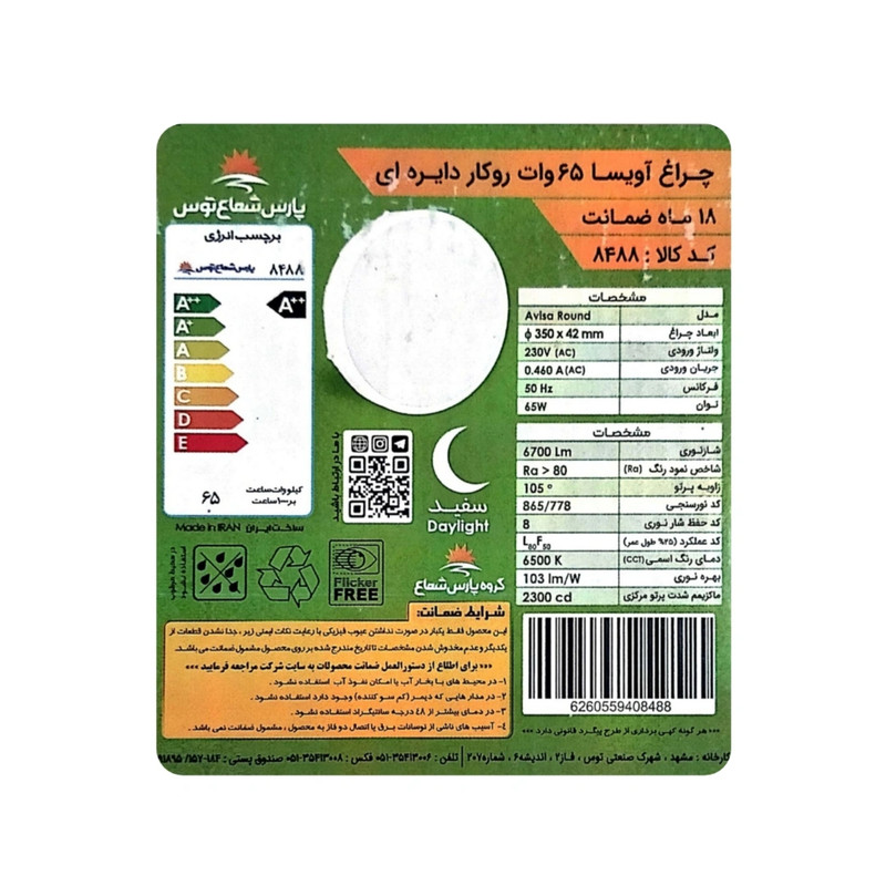 چراغ سقفی روکار 65 وات پارس شعاع توس به صورت روکار نصب میشود و دارای ابعاد 350*42 میلیمتر میباشد.نوع لامپ به کار رفته در آن smd است.زاویه تابش این چراغ 110 درجه میباشد و جنس بدنه آن از پلیمر فرآوری شده است و شار نوری 6700 لومن را دارد