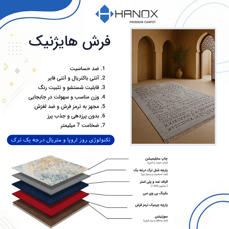 فرش هانوکس تولید کننده و صادرکننده فرش ماشینی هایژنیک (بدون تار و پود non-woven) ایرانی اقتصادی با قیمت به صرفه ، با علم و تجربه و ماشین آلات و تجهیزات پیشرفته انواع مدلهای فرش های بدون تاروپود و خواب و بدون پرز ضد حساسیت با ضخامت 7 میلیمتر تولید نموده که با نخ پلی استر گونه بکار رفته و روی آن پارچه بسیار لطیف شانل ترک که در آن حس نرمی و ظرافت خاصی مشابه فرشهای دستباف ریزباف اعلا را داده با طیف سایه روشن چشم نواز و تنوع رنگی بالا درخششی به یادماندنی به خانه هایتان بخشیده و محیط را دلبازتر میکند. ، یکی از زیباترین و به روزترین طرح های مدرن و مینیمال با ترکیب رنگی خاص میباشد و به دلیل رنگ زمینه فضا را در منزل مدرن تر با سالن های مدرنیزه را تداعی کرده ، در عین ظرافت از دوام و مقاومت بالایی برخوردار است و قابليت شستشو با آب سرد و ولرم تا 30 درجه و شامپو و يا اسپري لکه بر فرش را هم داراست . همچنین در اثر مصرف و شستشو هیچگونه تغییر حالت و سفتی در فرش ایجاد نمیشود . این فرش آنتی باکتریال ، عایق سرمایش و گرمایش ، ضد حساسیت ، آنتی فایر (عامل حریق نمی باشد ) و همچنین پشت آن دارای ترمز فرش از از لیز خوردن آن در سرامیک جلوگیری می کند