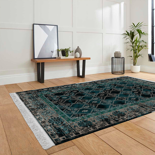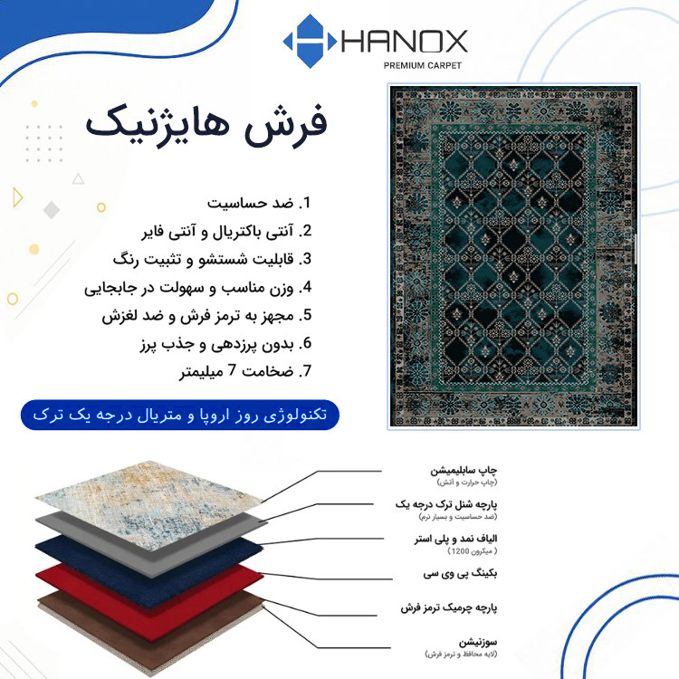 فرش ماشینی 1000 شانه هانوکس زمینه سبز حاشیه چند رنگ مدل مدرن کد L338