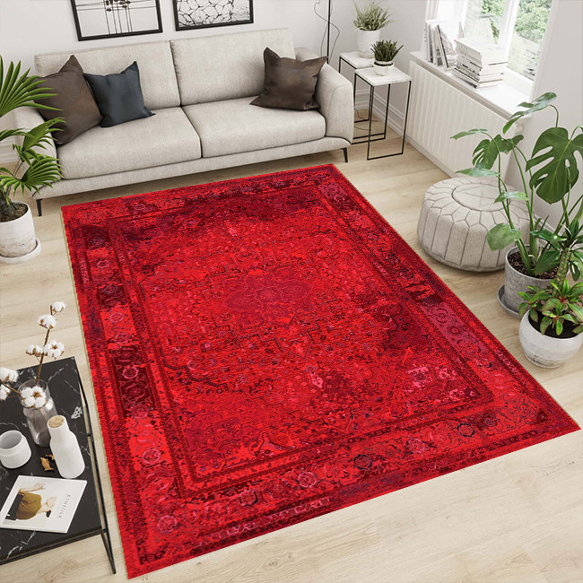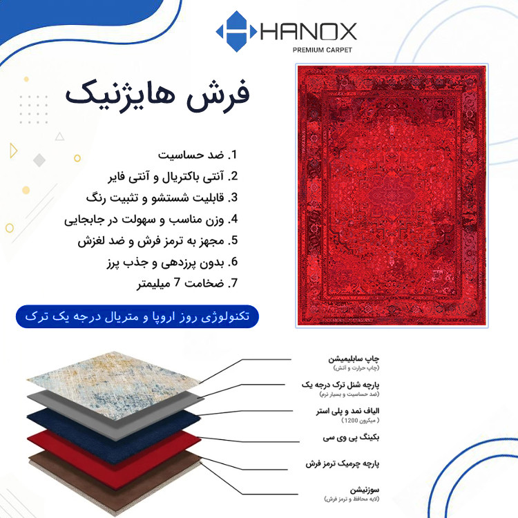فرش ماشینی 1000 شانه هانوکس زمینه قرمز حاشیه چند رنگ مدل لاکی کد L141