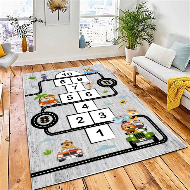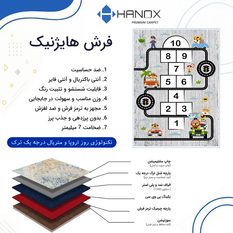 فرش ماشینی 1000 شانه هانوکس زمینه طوسی حاشیه آبی مدل کودک کد U300