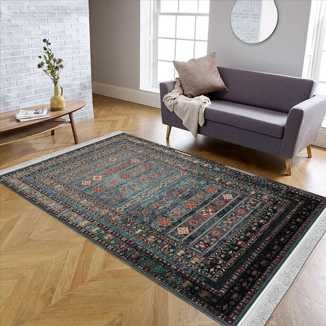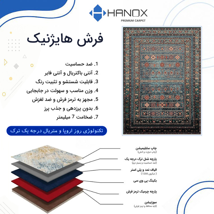 فرش ماشینی 1000 شانه هانوکس زمینه آبی حاشیه چند رنگ مدل مدرن کد L280