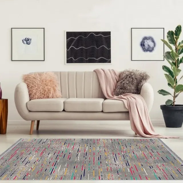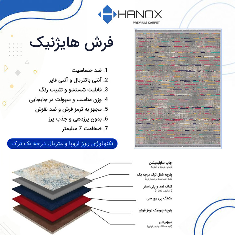 فرش ماشینی 1000 شانه هانوکس زمینه طوسی حاشیه چند رنگ مدل مینیمال کد HANM.0022.1