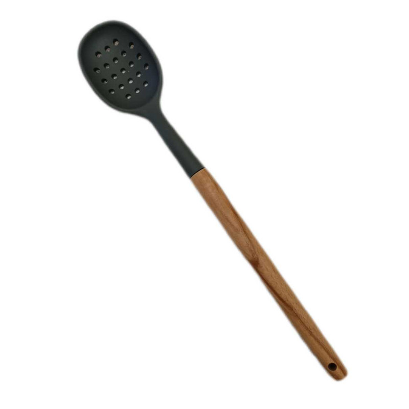 قاشق سوراخ دار شنگیا وارداتی ساخت چین ساخته از سلیکون با مقاومت دمایی بالای ۳۰۰ و دسته بامبو جهت آشپزی بهتر هست آبکشی و پخت و پز میباشد لبه های نرم آن مانع از آسیب رساندن به قابلمه های تفلون شما میشود