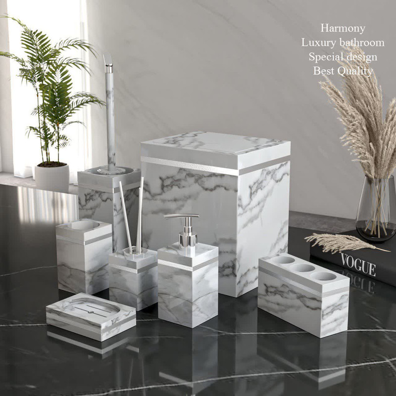 ست شامل هفت تیکه میباشد سطل بادبزنی فاقد سطل اضافه21.5*17.5ارتفاع25 سانتی متر فرچه 10*10ارتفاع 40 سانتی متر جای مایع7*7*17.5 جای مسواک15.5*6*7.5 لیوان اضافی7*7*11.5 جای صابون12*8*2.5 جای عود6.5*6.5*9