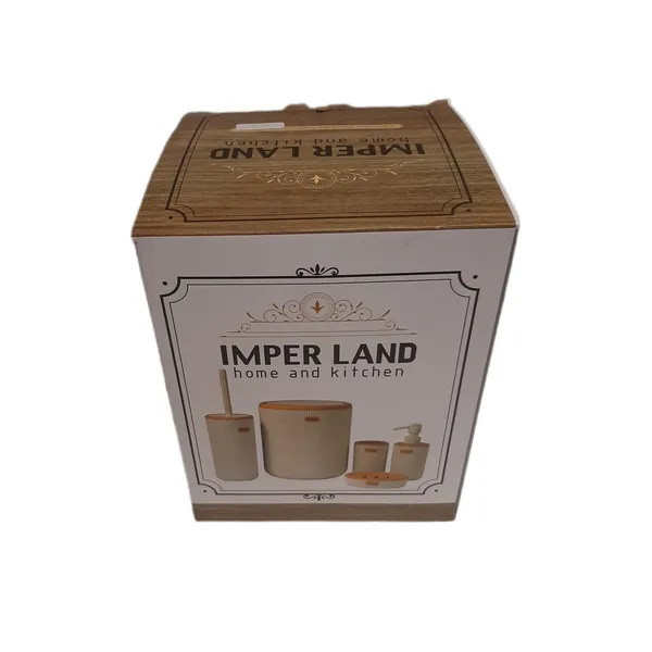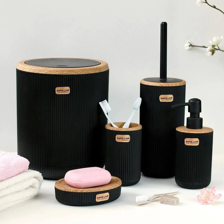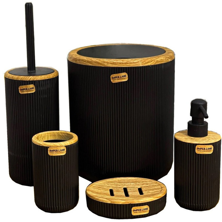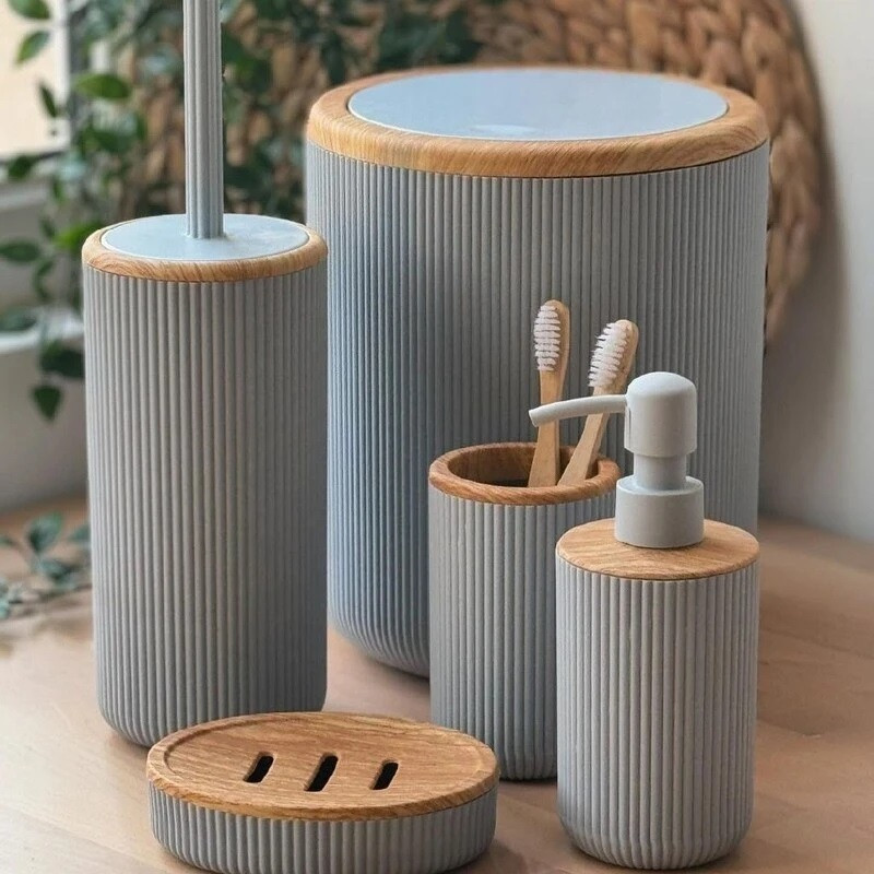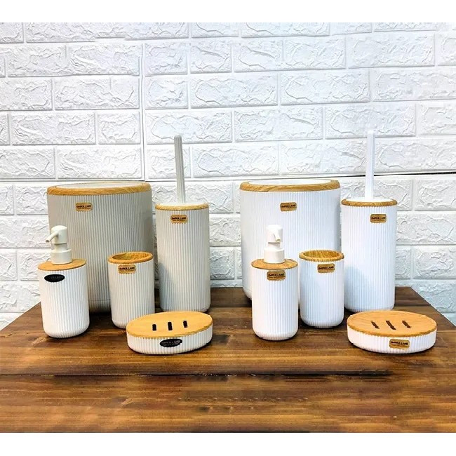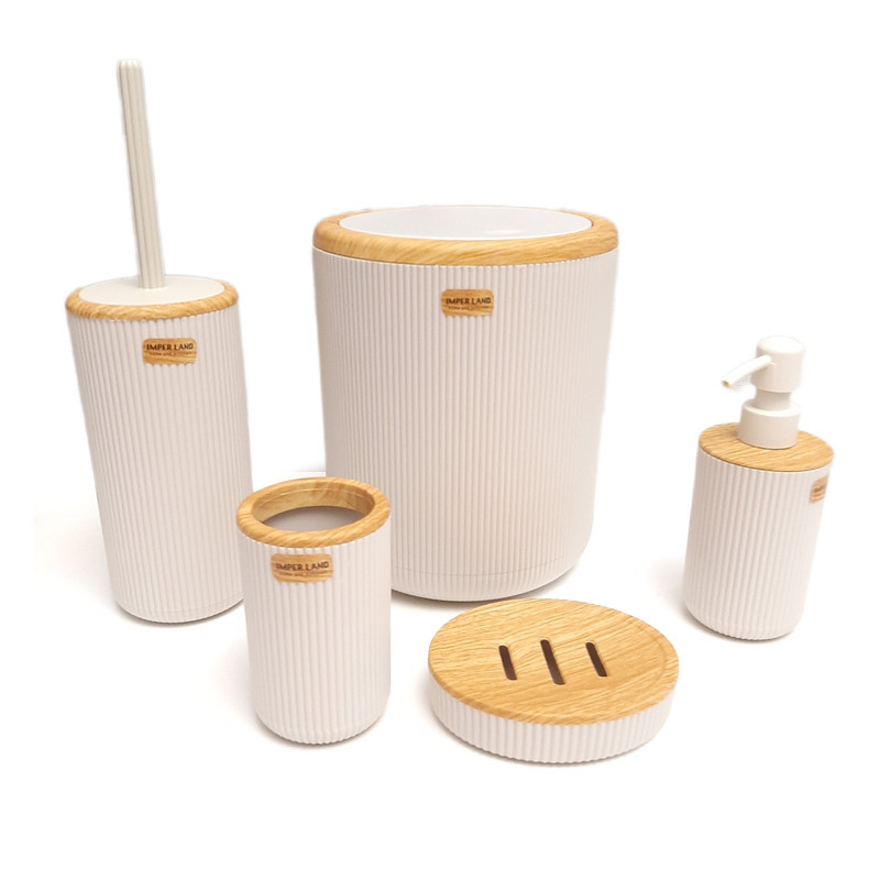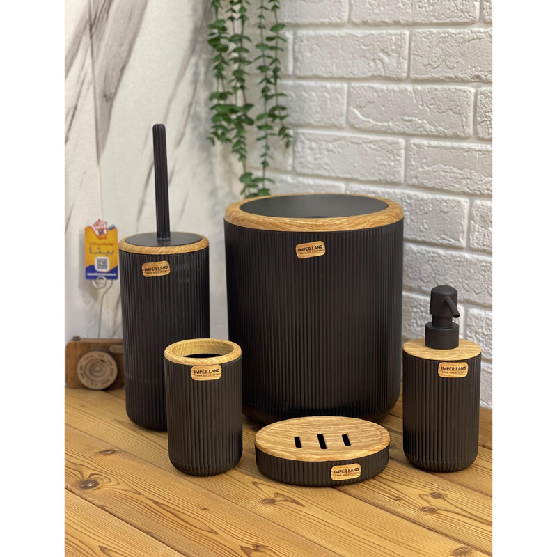 این ست تشکیل شده است از یک سطل زباله درب دار یک عدد برس شستشو به همراه محفظه یک عدد پمپ مایع دستشویی یک محفظه مسواک و یک عدد نگهدارنده صابون که همگی از جنس پلاستیک با کیفیت که با طرح چوب ادغام شده که زیبایی دو چندان به محصول نهایی بخشیده