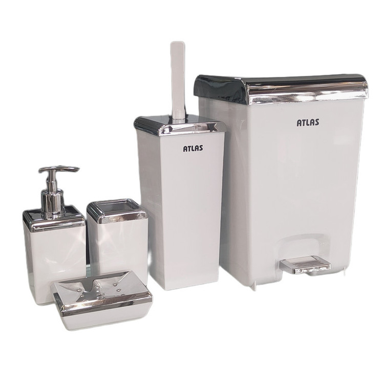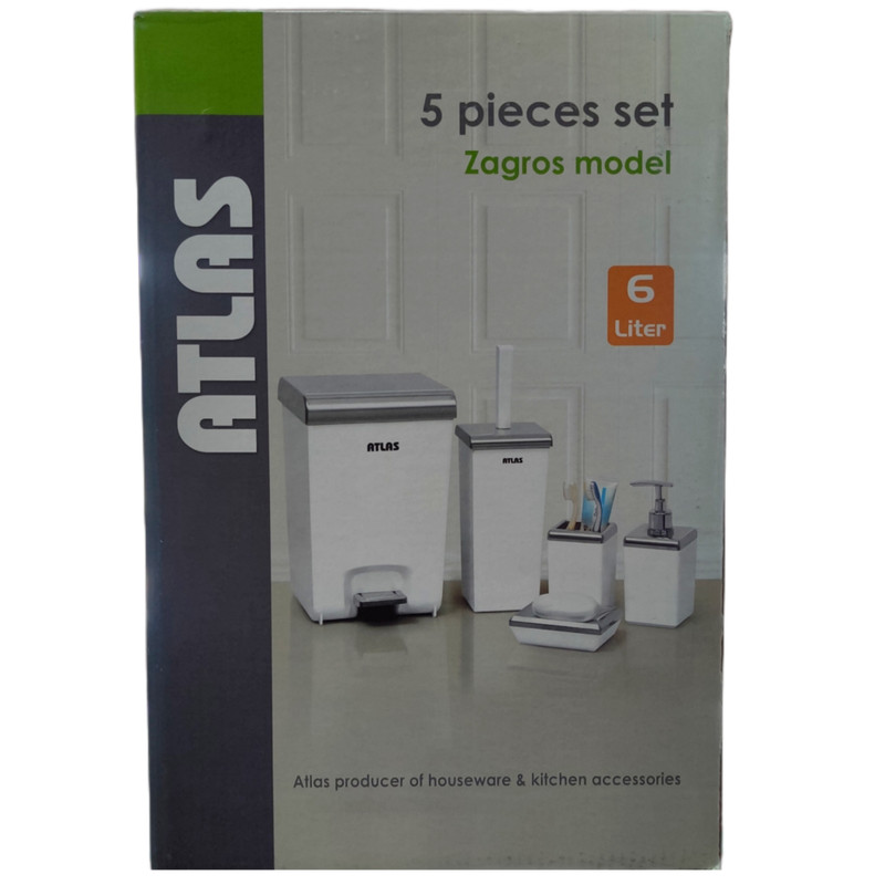 سطل زباله 20x19x31 - برس توالت شوی 11x11x37 - جاصابونی 9x12x4 - جامسواکی 7.5x7.5x12 - جامایع 7.5x7.5x18