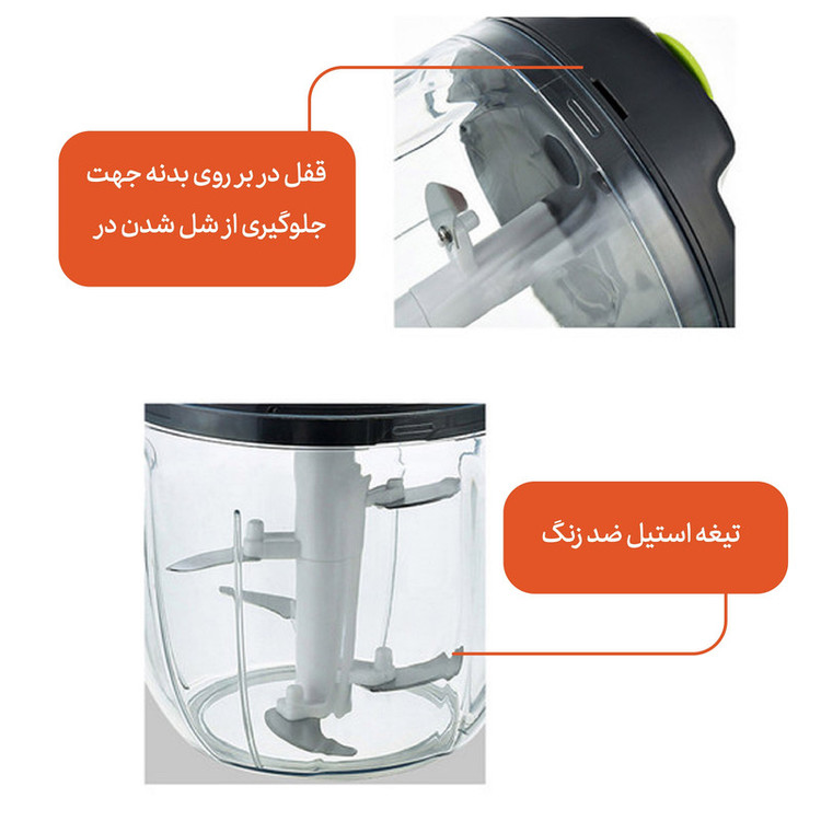 - جنس تیغه استیل ضد زنگ - تیغه 5 پر تیز و با کیفیت، مناسب برای خرد کردن انواع سبزیجات و میوه ها - ریسمان محکم - وجود نوار لاستیکی زیر خردکن که باعث عدم لیز خوردن حین کار میشود. - مجهز به یک محفظه روی درب اصلی برای خالی کردن راحت مایعات