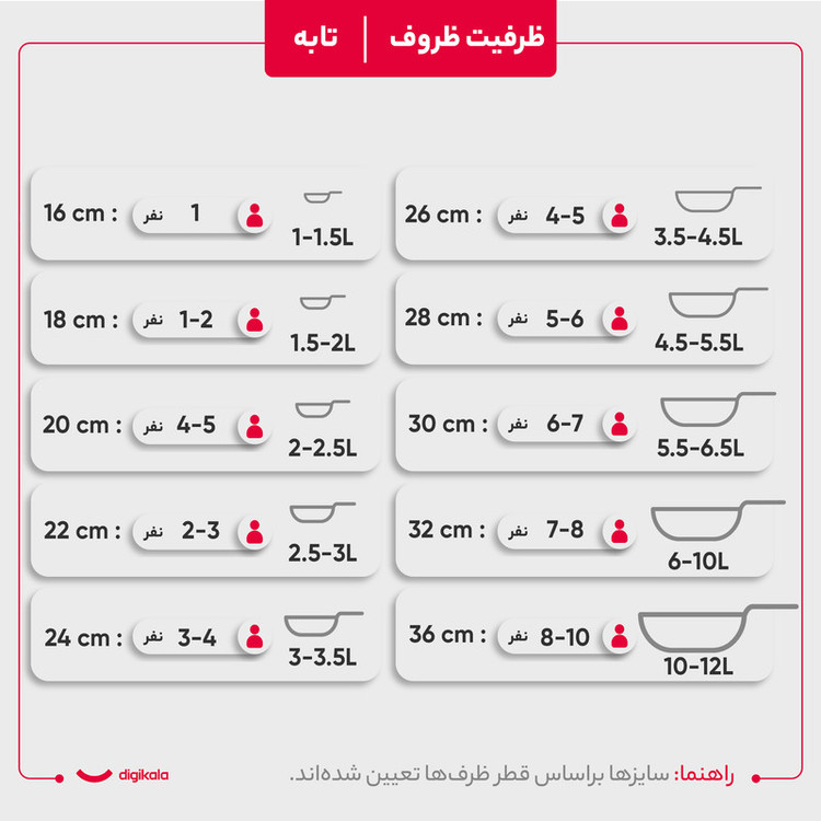 وزن ظروف: قابلمه سایز 28: 2000 گرم - قابلمه سایز 24: 1640 گرم - قابلمه سایز 32: 2325 گرم - قابلمه سایز 20: 1075 گرم، تابه دو دسته سایز 28: 1980 گرم، تابه دوطرفه سایز 32: 1900 گرم