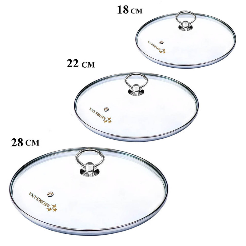 مجموعه 3 عددی درب پیرکس مرسانا، در سایزهای 28 سانتیمتر، 22 سانتیمتر و 18 سانتیمتر از جنس پیرکس بوده و دارای دستگیرهء فلزی به رنگ نقراه ای میباشد که برای انواع ماهیتابه و قابلمه در سایزهای مذکور قابل استفاده میباشد.