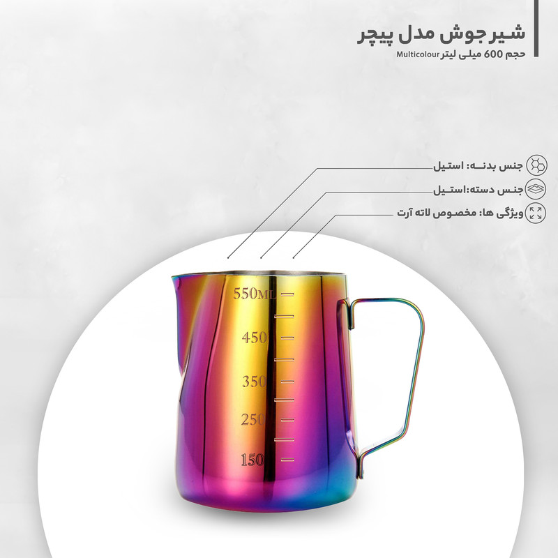 پیچر مدرج Multicolour حجم 600 میلی لیتری یکی از لوازم جانبی مورد نیاز برای هر باریستای حرفه ای است. پیچر به همان ظرف مخصوص تهیه کف شیر، گفته میشود که جهت استفاده، در زیر نازل بخار دستگاههای اسپرسو ساز طراحی شده است. یکی از خصوصیت های منحصر به فرد این پیچر مدرج بودن آن است ، این پیچر از جنس استیل ضد زنگ است. از این ظرف با طراحی دستهی محکم، پیچری خوش دست برای لاته آرت به شمار میرود.