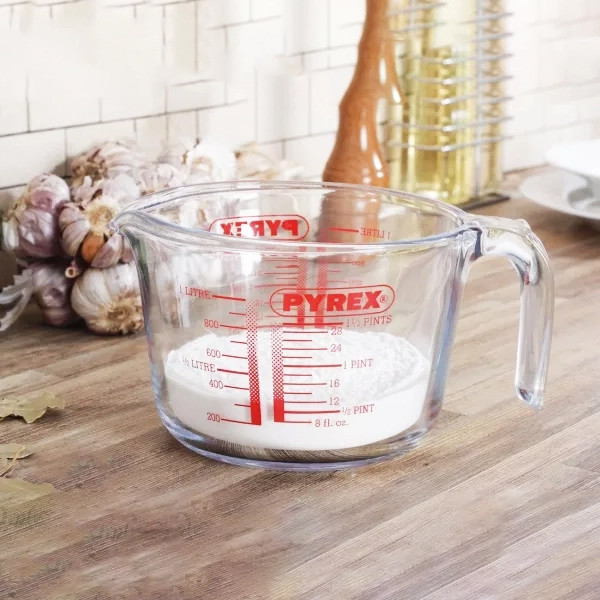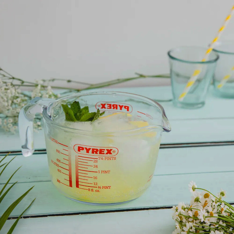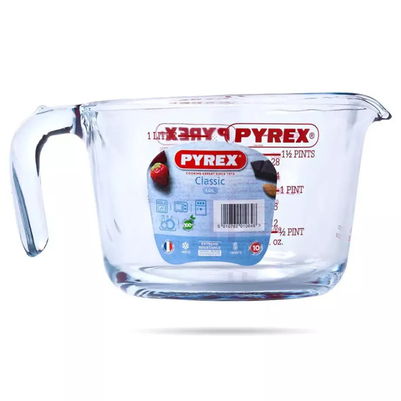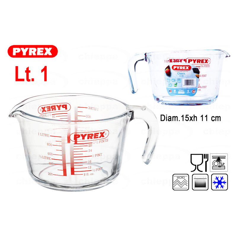 ظرف مدرج دسته دار پیرکس ساخت فرانسه یا به اصطلاح خودمانی شیرجوش یکی از محصولات پرفروش برند پیرکس است که برای مخلوط کردن -اندازه گیری و جوشاندن مواد از آن استفاده میشود.این محصول دارای حجم یک لیتری میباشد که قطر دهانه ی آن حدود 15 سانتی متر و عمق آن حدود 11 سانتی متر است.این ظرف تحمل دما از -40 تا +300 درجه را دارد و قابل استفاده در فر-مایکروفر-یخچال-فریزر و شعله ی مستقیم(با شعله پخش کن یا شعله ی کوچک) است.هنگام استفاده ی ظروف پیرکس از تغییر ناگهانی دما سرد به گرم یا برعکس جلوگیری کنید.همچنین این ظروف به علت پروسه ی ساخت خاص ممکن است دارای حباب ریز و اثرات قالب گیری کالا در کف ظرف باشند که گاهی شبیه به ترک به نظر می رسند ولی به هیچ عنوان مشکل فیزیکی نیست و با خیال راحت می توانید از آنها استفاده نمایید.