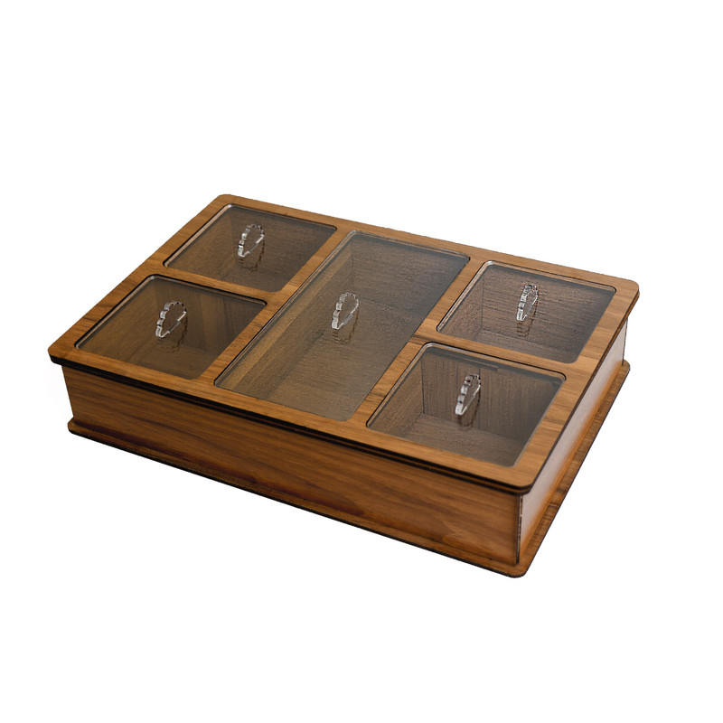 این محصول دارای 5 قسمت می باشد که 4 قسمت آن ابعاد 75x75 میلی متر و یک قسمت آن ابعاد 160x75 میلی متر دارد. بدنه این محصول از جنس چوب دو طرف روکش شده با روکش فندقی می باشد و درب های قسمت های مختلف از جنس ورق اکریلیک شفاف می باشد که از نفوذ گرد و غبار جلوگیری می کند.