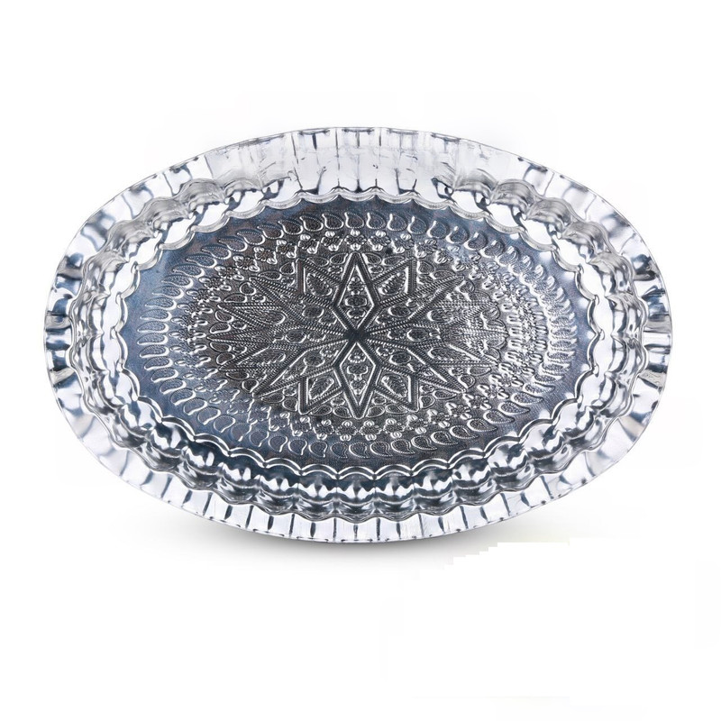 سینی استیل طرح دار با طرح برجسته لوزی تولید شده که استیل به کار رفته در آن با کیفیت و مقاوم می باشد و همچنین برای سرو غذا و پذیرایی در رستوران و کافه و مهمانی های دورهمی مناسب می باشد. مجموعه 6 عددی سینی می باشد که قطر هر سینی 21 سانتی متر می باشد.