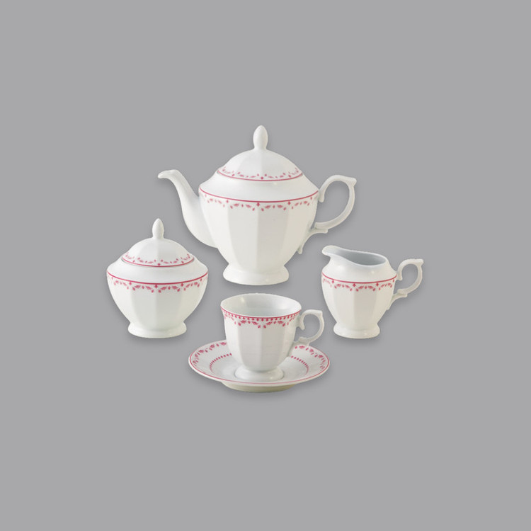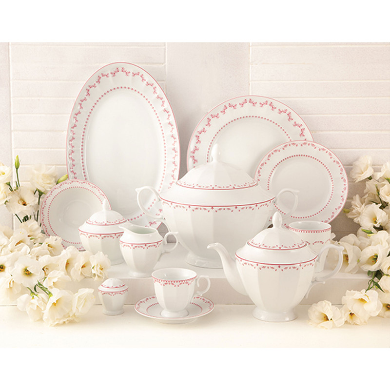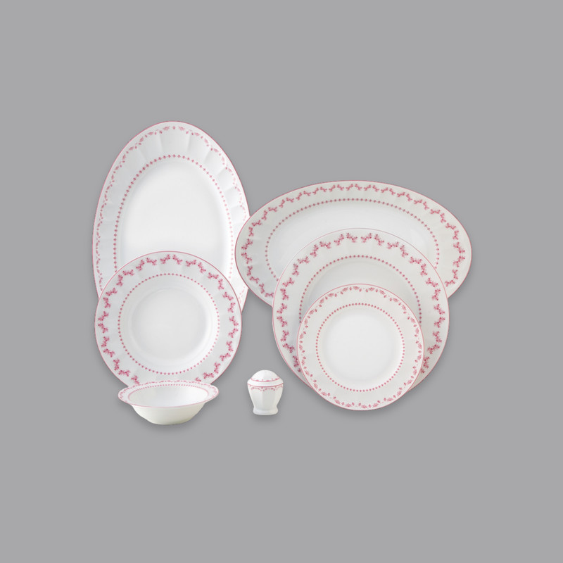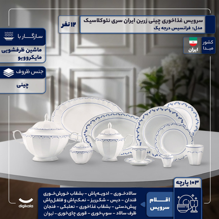 اقلام سرویس: سوپخوری , ظرف سالاد , دیس , بشقاب غذاخوری , بشقاب خورشخوری , پیشدستی , قوری چایخوری , فنجان , نعلبکی , قندان , شکرریز , نمکپاش و فلفلپاش , لیوان , سالادخوری , ادویهپاش