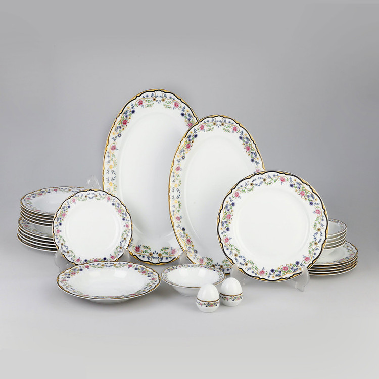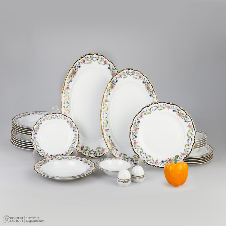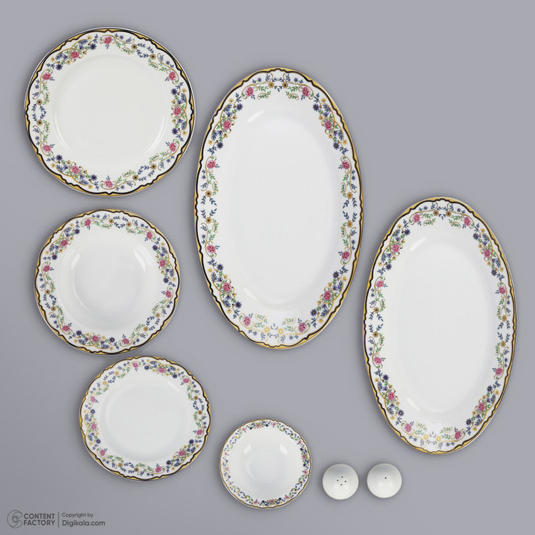 اقلام سرویس: دیس , بشقاب غذاخوری , بشقاب خورشخوری , پیشدستی , نمکپاش و فلفلپاش , پیاله