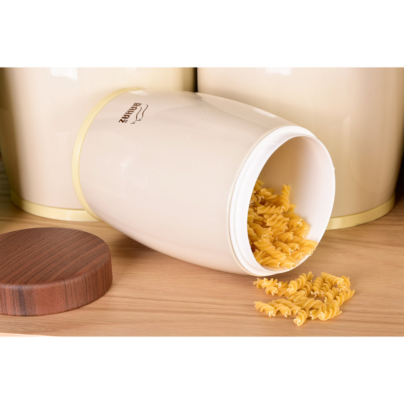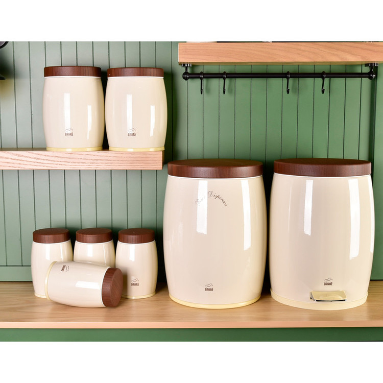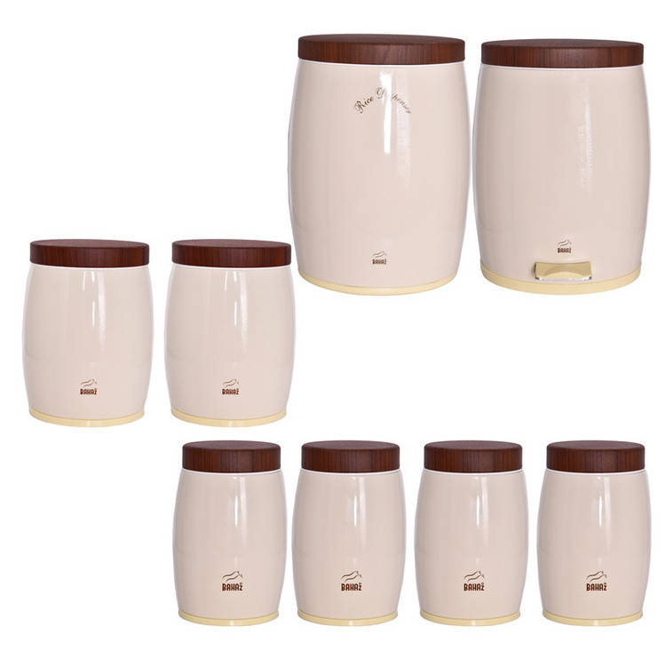 این ست شامل : 1 عدد سطل زباله ، 1 عدد سطل برنج ، 1 عدد سطل قند ، 1 عدد سطل شکر، 4 عدد جا حبوبات