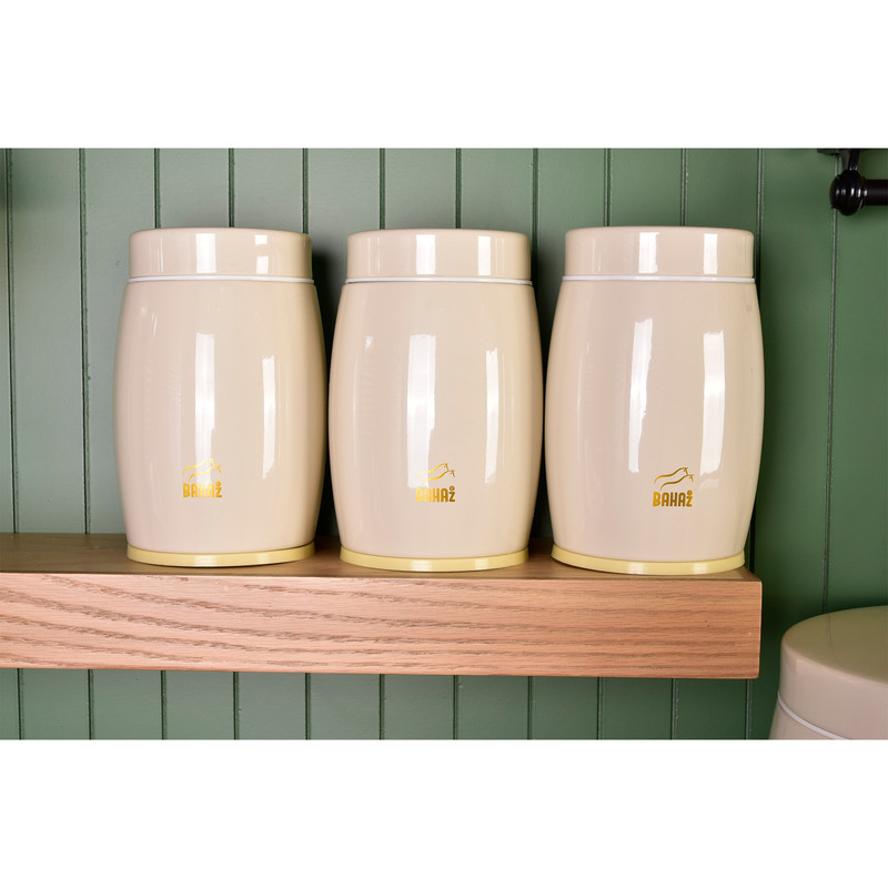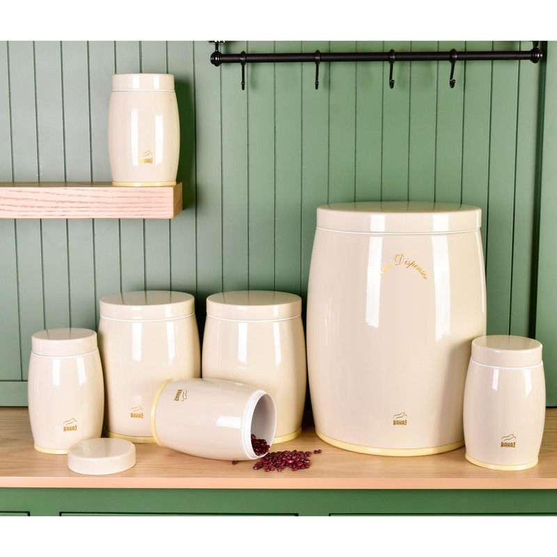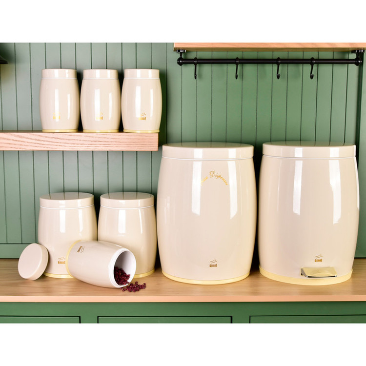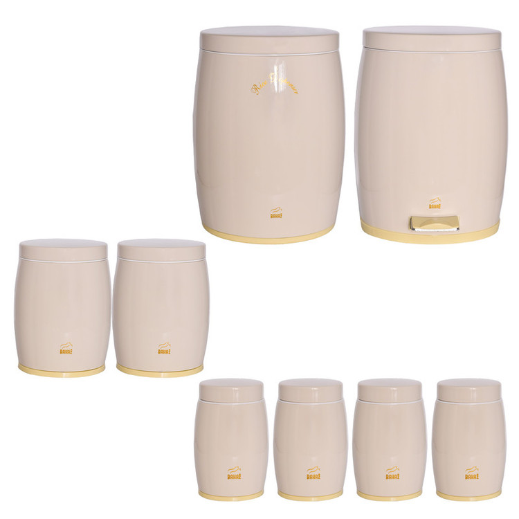 این ست شامل : 1 عدد سطل زباله ، 1 عدد سطل برنج ، 1 عدد سطل قند ، 1 عدد سطل شکر، 4 عدد جا حبوبات