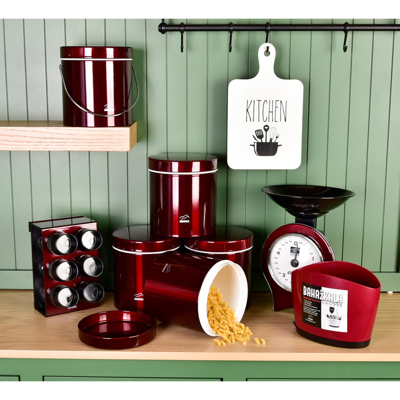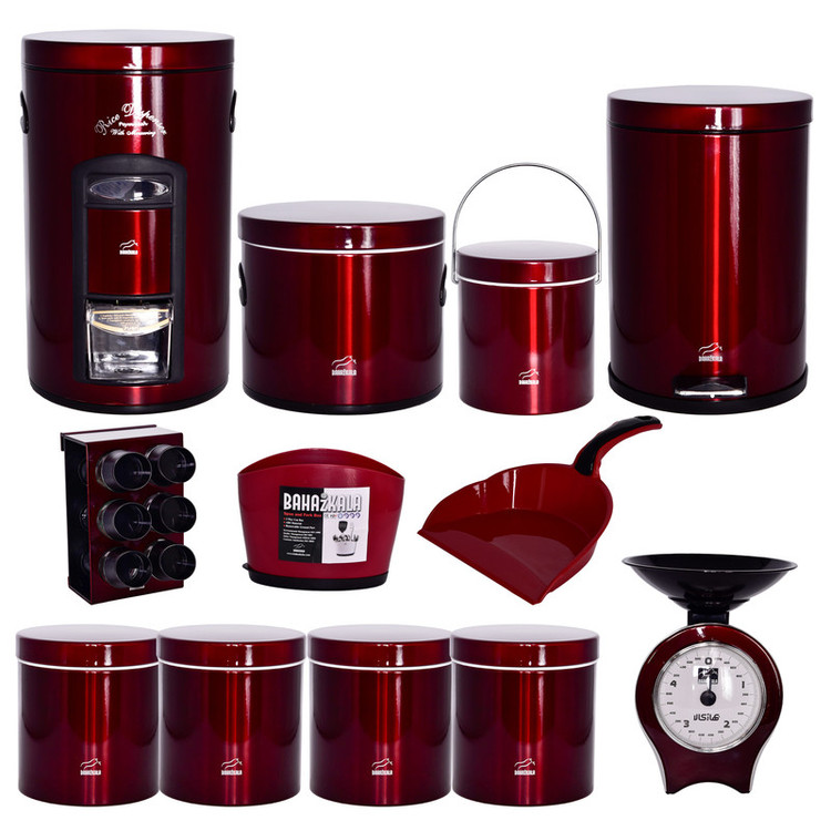 این ست شامل : 6 عدد جای ادویه همراه استند ، 4عدد ظرف حبوبات، 1 عدد سطل زباله ، 1 عدد سطل برنج ، 1 عدد جای قند، 1 عدد جای شکر. 1 عدد ترازو ، 1 عدد خاک انداز ، 1 عدد جاقاشقی