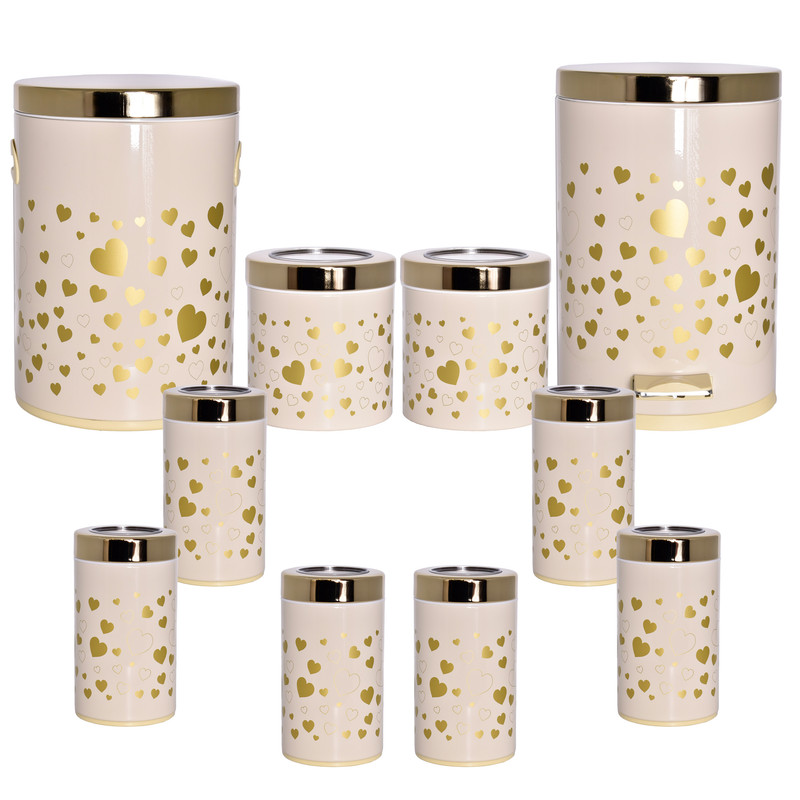این ست شامل : 1 عدد سطل زباله ، 1 عدد سطل برنج ، 1 عدد سطل قند ، 1 عدد سطل شکر، 6 عدد جا حبوبات