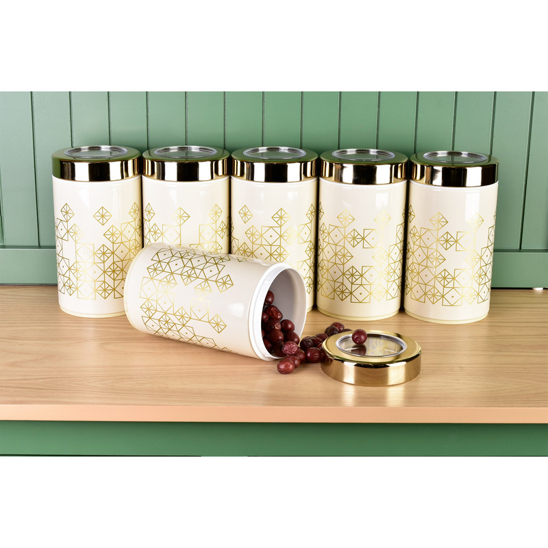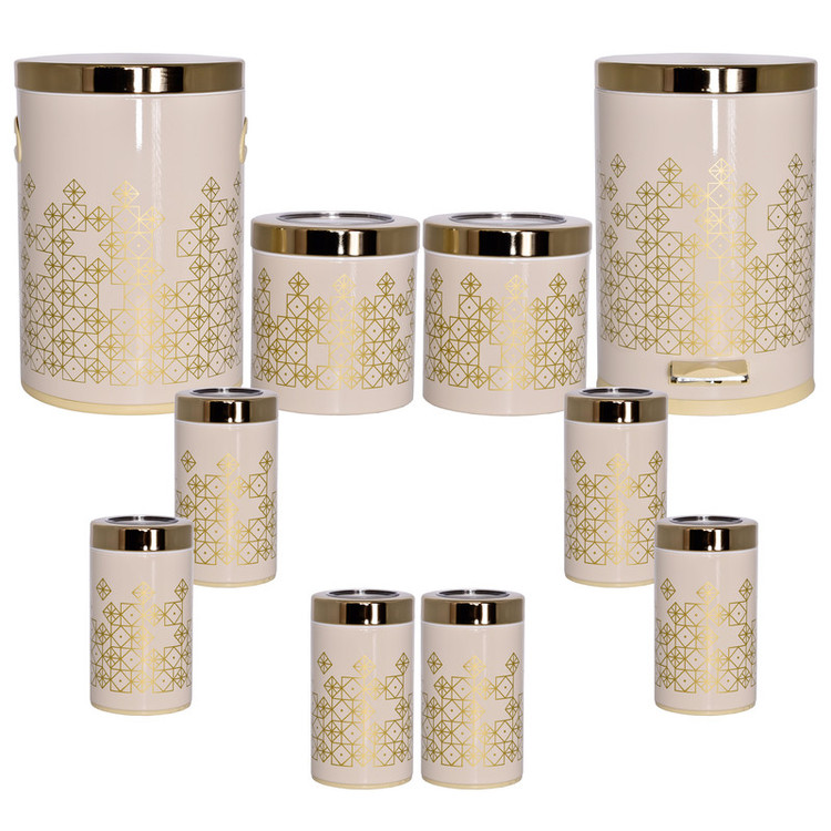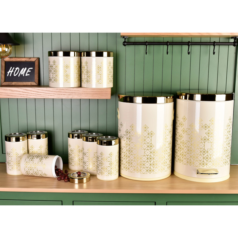این ست شامل : 1 عدد سطل زباله ، 1 عدد سطل برنج ، 1 عدد سطل قند ، 1 عدد سطل شکر، 6 عدد جا حبوبات