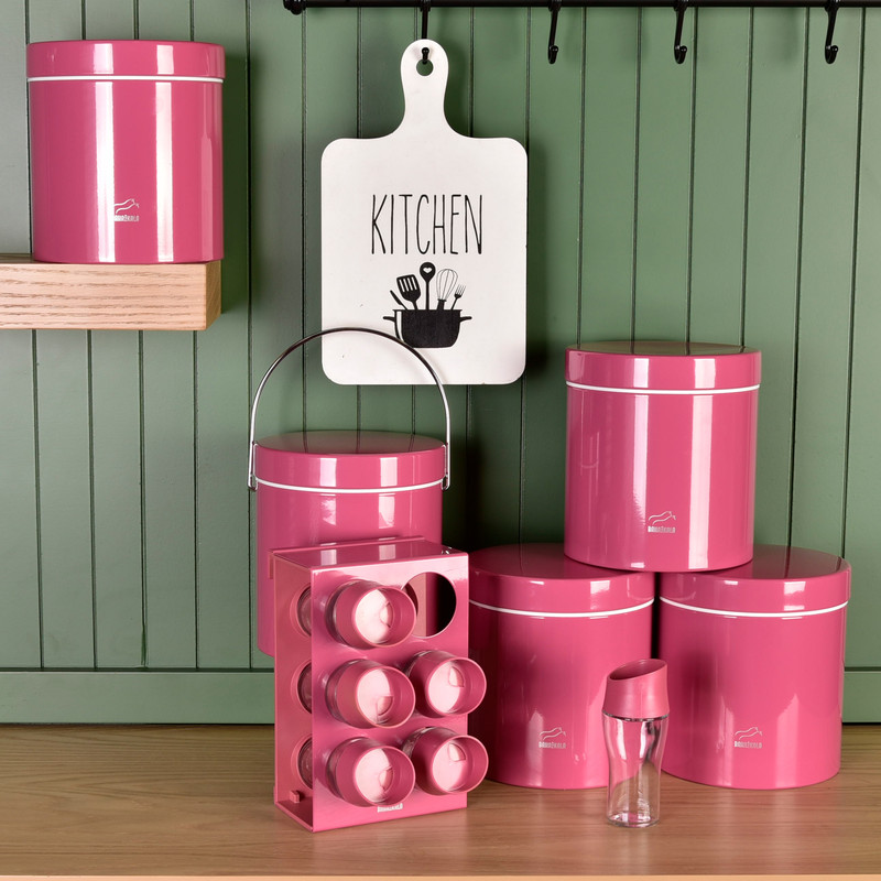 این ست شامل :6 عدد جای ادویه همراه استند ، 4عدد ظرف حبوبات، 1 عدد سطل زباله ، 1 عدد سطل برنج ، 1 عدد جای قند، 1 عدد جای شکر.1 عدد سینی 1 عدد خاک انداز ، 1 عدد سطل زباله کوچک