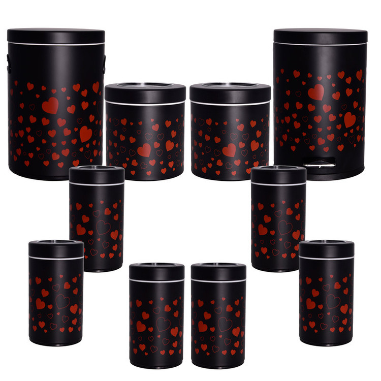 این ست شامل : 1 عدد سطل زباله ، 1 عدد سطل برنج ، 1 عدد سطل قند ، 1 عدد سطل شکر، 6 عدد جا حبوبات