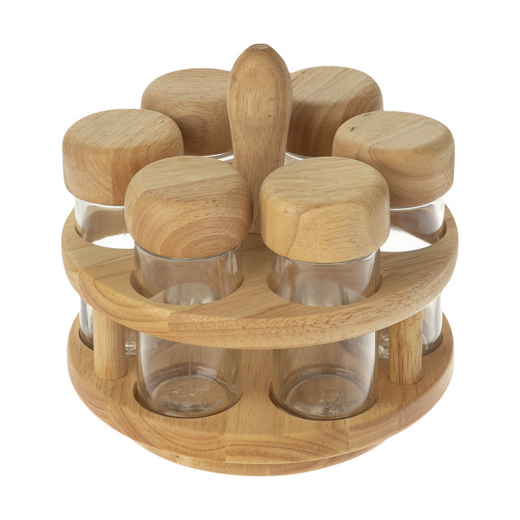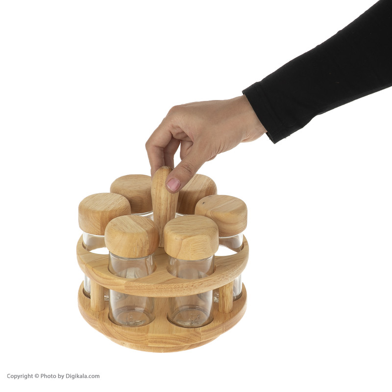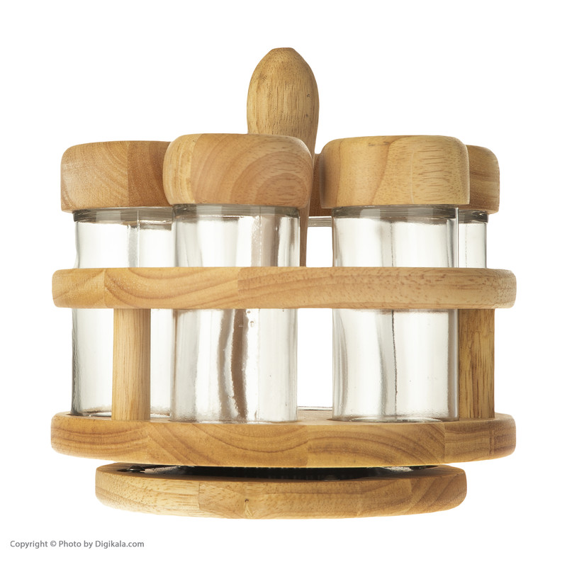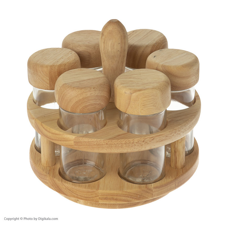 ساخته شده از چوب رابر دارای رنگ روشن و نقش و خلل و فرج طبیعی شامل 6 جا ادویه شیشه ای با درب چوبی هر یک به قطر 4 و ارتفاع 10 سانتیمر با خروجی ثابت قابلیت چرخش 360 درجه استند نگهدارنده به هر دو طرف شیک و ساده دارای جعبه ساخت کشور ایران