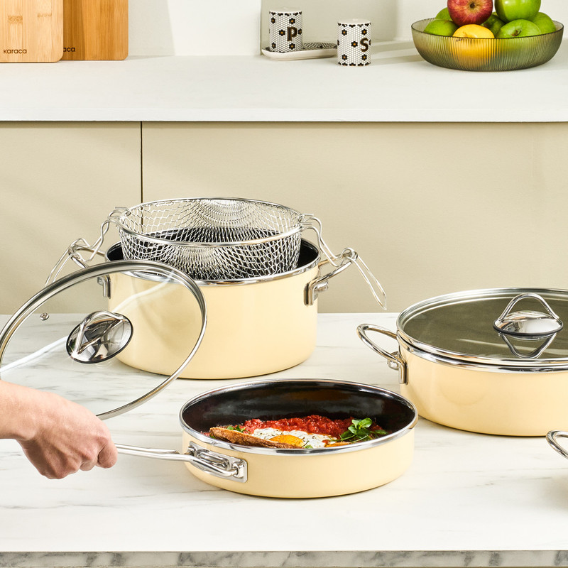 مجموعه Karaca Erva Enamel Series با طراحی مدرن و ظاهری شیک، آماده است تا فضای آشپزخانه شما را با جلوهای استثنایی تزئین کند. این مجموعه با رنگهای روشن و سطحی صاف و براق، حسی از تمیزی و ظرافت را منتقل میکند که هرگز از مد نمیافتد.یکی از ویژگیهای برجسته این مجموعه، استفاده از روکش لعاب 900 درجه است که به محصول مقاومت فوقالعادهای در برابر دماهای بالا و تغییرات ناگهانی دما میدهد. این ویژگی اطمینان حاکی از آن است که ظروف حتی در شرایط پخت و پز سنگین یا حرارت مستقیم، دچار ترک خوردگی یا آسیب نخواهند شد. علاوه بر این، این ظروف عاری از هرگونه باکتری و مواد سمی هستند و به دلیل استانداردهای سختگیرانه تولید، کاملاً برای سلامتی مناسب طراحی شدهاند.مجموعه Karaca Erva Enamel Series با طراحی مدرن و ظاهری شیک، آماده است تا فضای آشپزخانه شما را با جلوهای استثنایی تزئین کند. این مجموعه با رنگهای روشن و سطحی صاف و براق، حسی از تمیزی و ظرافت را منتقل میکند که هرگز از مد نمیافتد.یکی از ویژگیهای برجسته این مجموعه، استفاده از روکش لعاب 900 درجه است که به محصول مقاومت فوقالعادهای در برابر دماهای بالا و تغییرات ناگهانی دما میدهد. این ویژگی اطمینان حاکی از آن است که ظروف حتی در شرایط پخت و پز سنگین یا حرارت مستقیم، دچار ترک خوردگی یا آسیب نخواهند شد. علاوه بر این، این ظروف عاری از هرگونه باکتری و مواد سمی هستند و به دلیل استانداردهای سختگیرانه تولید، کاملاً برای سلامتی مناسب طراحی شدهاند.دستگیرههای این مجموعه با روکش تیتانیوم و طراحی ضد حریق، تجربهای راحت و ایمن را برای کاربر فراهم میکنند. این دستگیرهها نه تنها زیبا و انعطافپذیر هستند، بلکه در برابر خوردگی و سایش نیز مقاومت بسیار بالایی دارند. به همین دلیل، این ظروف میتوانند رنگ و درخشش خود را برای سالیان متمادی حفظ کنند و ظرافت خود را به عنوان یک قطعه لوکس در آشپزخانه دائمی نگه دارند.