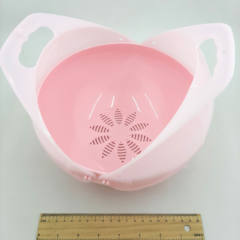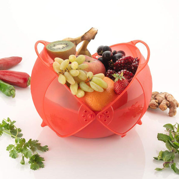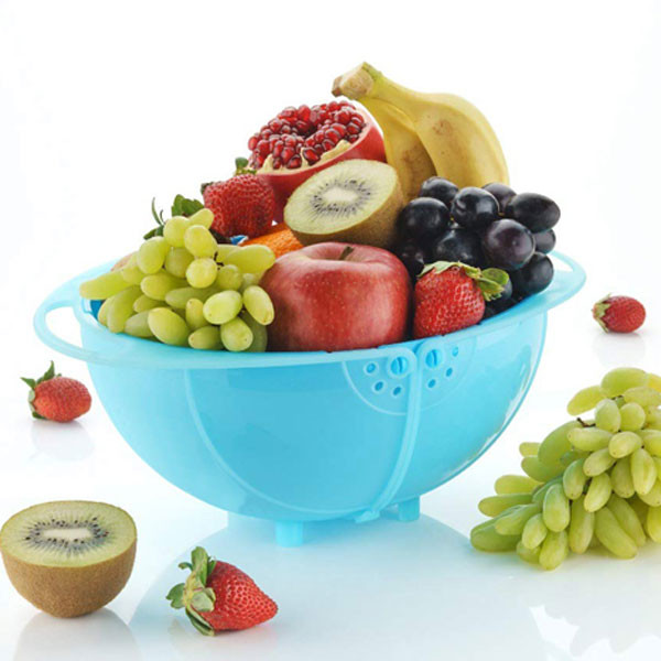 سبد میوه دوطرفه آبکش دار ، محصولی تولید شده از جنس پلاستیک فشرده با طراحی ظاهری زیبا و عملکردی کاربردی تر از نمونه های مشابه می باشد . این محصول شامل یک سبد آبکش دار و دو کفی دوار که در کنار هم یک نیم دایره را تشکیل می دهند ، است . محفظه اصلی یک لگن با کفی آبکش دار می باشد که از آن می توان برای شست و شو و آبکشی مواد غذایی نظیر میوه و سبزیجات استفاده نمود . با کشیدن دستگیره ها به سمت بالا شاهد بیرون آمدن نیم کره دواری خواهید بود که در زیر سبد تعبیه شده است ، به گونه ای که محتویات داخل سبد به صورت کامل داخل محفظه پوشش داده می شوند . در این حالت دستگیره ها در بالاترین قسمت سبد برای حمل آسان ظرف قرار خواهند گرفت . لگن آبکش دار دو طرفه در رنگ های متنوع و زیبا جهت استفاده در آشپزخانه منزل ، پیک نیک ، سفر و ... ، برای نگهداری و حمل آسان مواد غذایی نظیر میوه و سبزیجات مناسب است