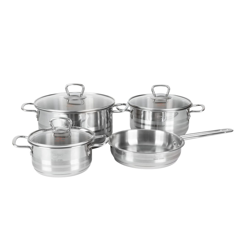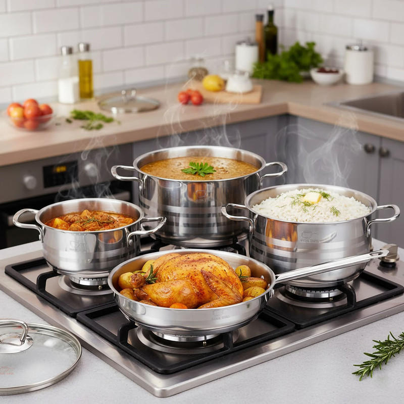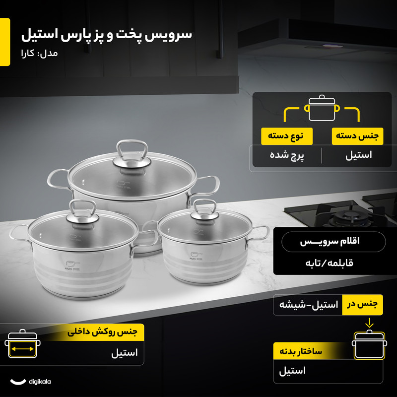 اقلام سرویس شامل قابلمههایی در سایزهای ۱۶، ۲۰ و ۲۴ سانتیمتر به همراه یک تابه تکدسته ۲۰ سانتیمتری است که نیازهای پختوپز روزمره را به خوبی پوشش میدهد. دستههای استیل پرچشده استحکام بالایی دارند و در برابر حرارت مستقیم مقاوم هستند. درهای استیل شیشهای نیز ضمن حفظ حرارت، امکان مشاهدهی روند پخت غذا را فراهم میکنند.