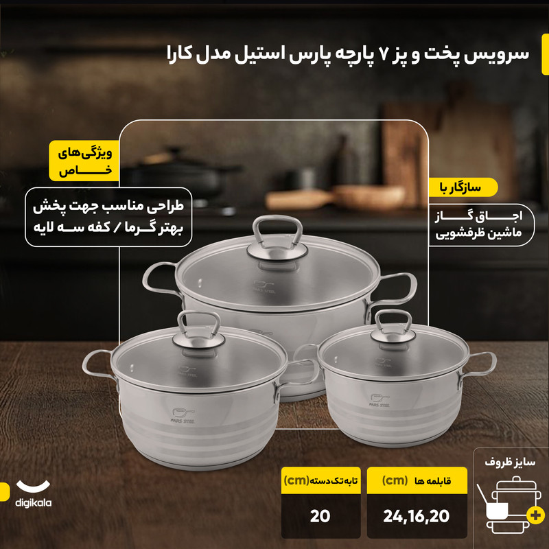 سرویس پختوپز ۷ پارچه پارس استیل مدل کارا با کیفیت ساخت بالا و طراحی ساده اما حرفهای، انتخابی ماندگار برای آشپزخانههای ایرانی است. این سرویس قابلمه و تابه از استیل براق و مقاوم ساخته شده و در برابر حرارت، ضربه و زنگزدگی دوام بالایی دارد.