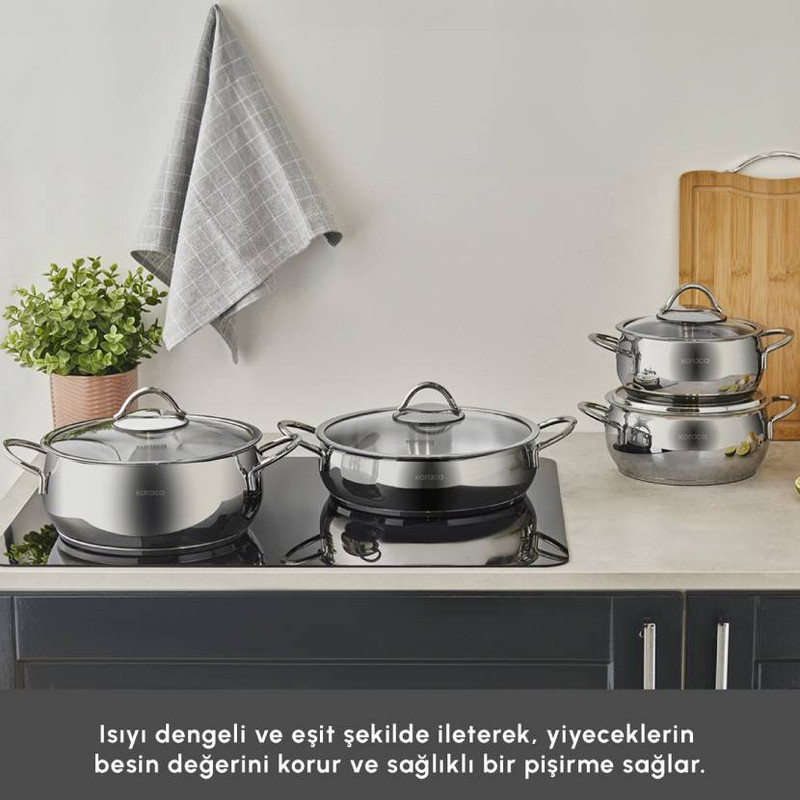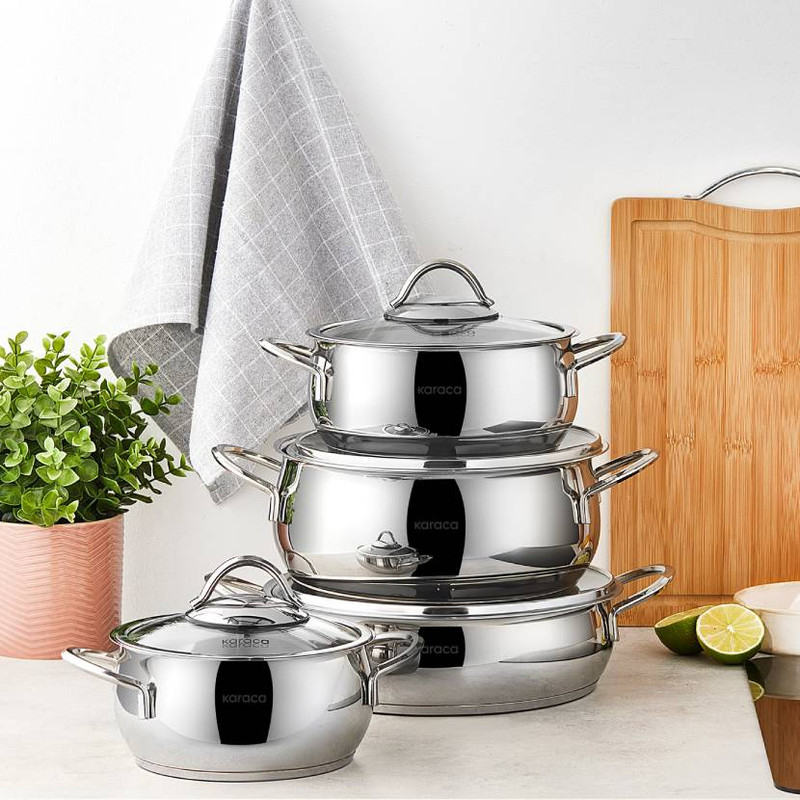 سرویس قابلمه استیل ۸ پارچه کاراجا اورلا، با ترکیبی از ظرافت و دوام، با ساختار بادوام و عملکرد پخت عالی، بهترین یاور شما در آشپزخانه خواهد بود!لستیل ضد زنگ با کیفیت بالا استفاده سالم و ایمن را فراهم میکند و طعمها را حفظ میکند.توزیع یکنواخت حرارت تضمین میکند که تمام قسمتهای غذای شما به طور یکسان پخته شود.طراحی ارگونومیک و شیک با ظاهری مدرن و بیانتها، با آشپزخانه شما هماهنگ میشود.قابلمهها در اندازههای مختلف از کوچک تا بزرگ، گزینههای ایدهآلی برای هر دستور غذایی ارائه میدهند.سطح تمیز شونده آسان قابل شستشو در ماشین ظرفشویی، باعث صرفه جویی در زمان می شود.این سرویس شامل یک عدد قابلمه عمیق قطر 16 سانتی متر همراه درب،یک عدد قابلمه عمیق قطر 18 سانتی متر همراه درب،یک عدد قابلمه عمیق قطر 22 سانتی متر همراه درب ویک عدد نیم قابلمه قطر ۲4 سانتی متر هست.