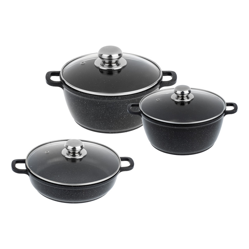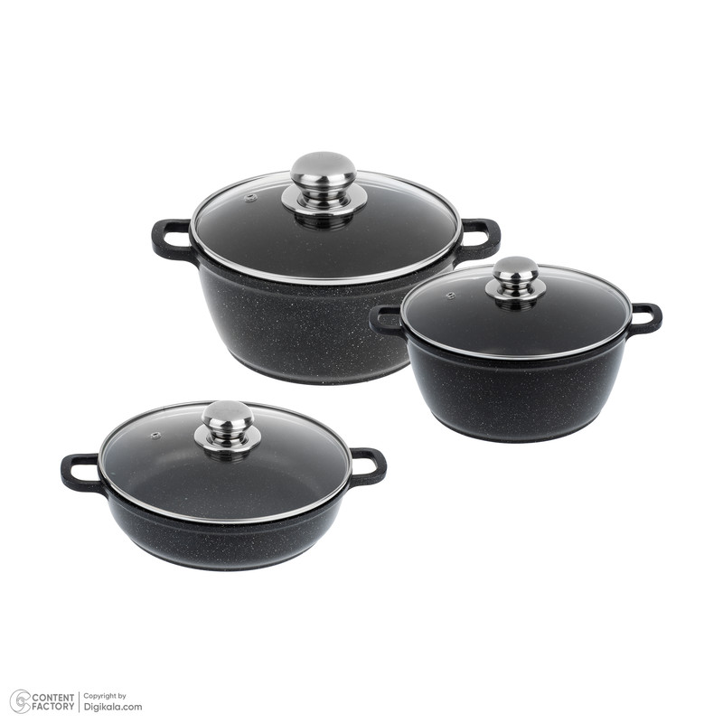 وزن ظروف: تابه بدون در : 795 گرم - به همراه در : 1365 گرم / قابلمه بزرگ بدون در : 1065 گرم - به همراه در : 1640 گرم / قابلمه کوچک بدون در : 920 گرم - همراه در : 1335 گرم